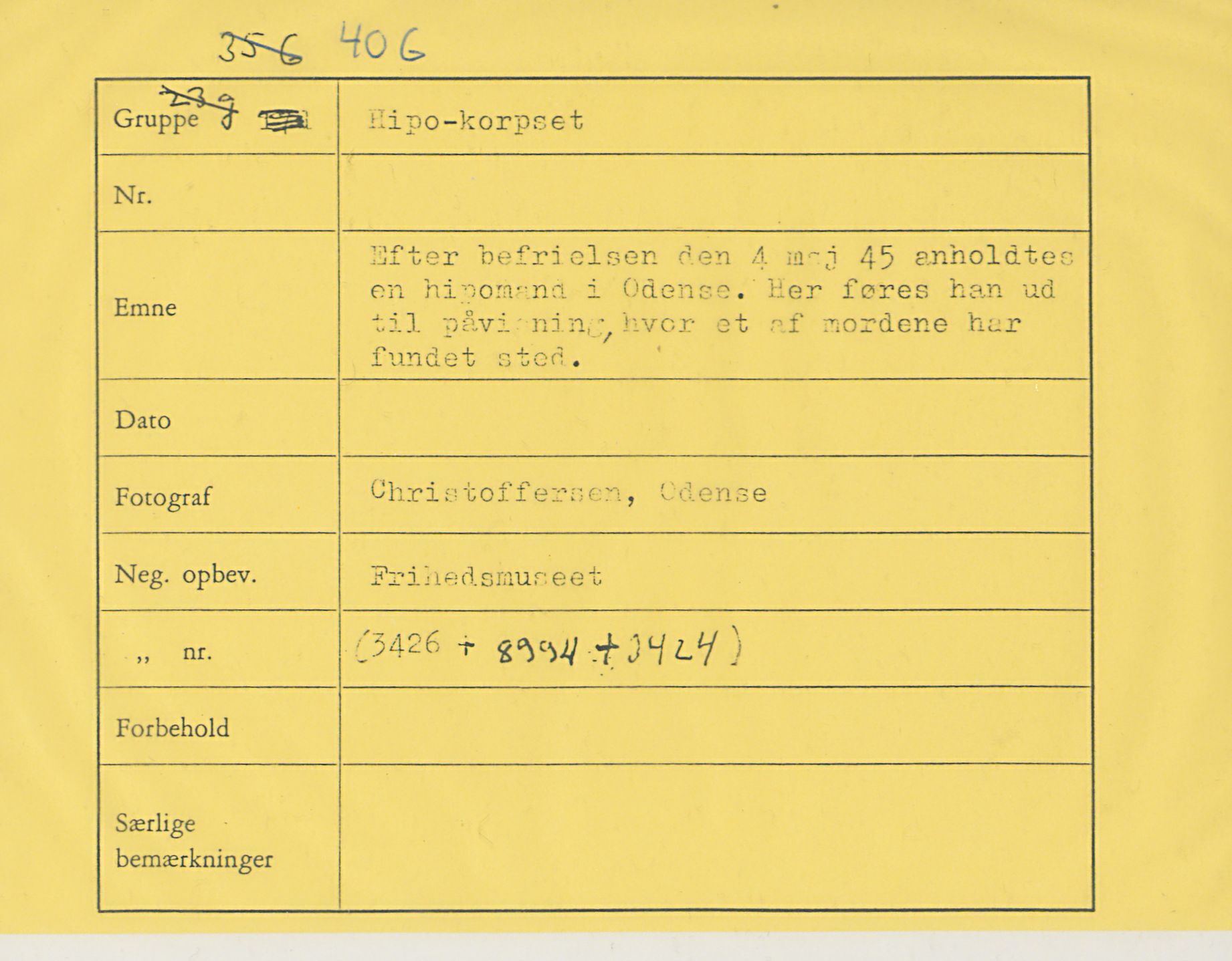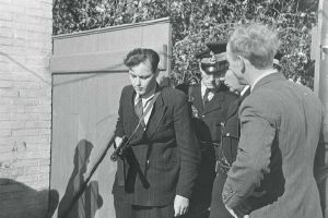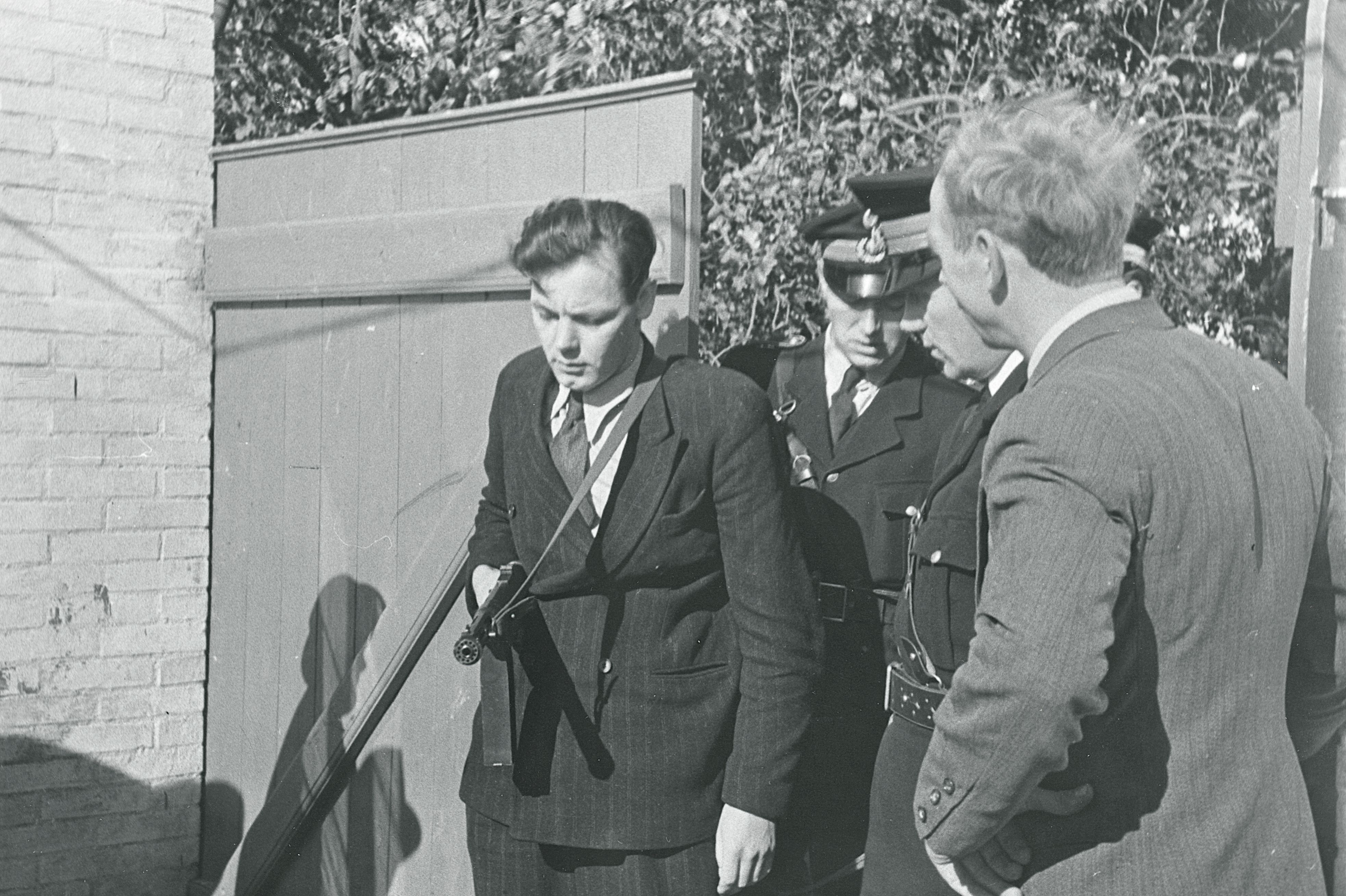 Gestapomanden Erik Laurits Larsen under åstedsforretning på adressen Tværvej 12 i Svendborg i forbindelse med retsopgøret efter befrielsen. Modstandsmanden Vilhelm Rosendal Jensen blev nedskudt og dræbt på adressen d. 10.4.1945.