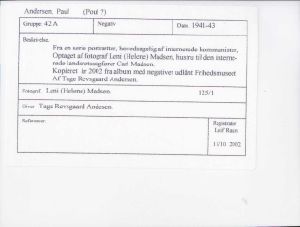 Paul Andersen. Kommunist. Optaget af fotograf Leni (Helene) Madsen, hustru til den internerede landsretssagfører Carl Madsen. Kopieret år 2002 fra album med negativer udlånt Frihedsmuseet af Tage Revsgaard Andersen.