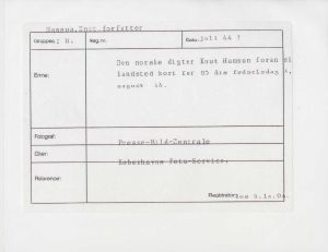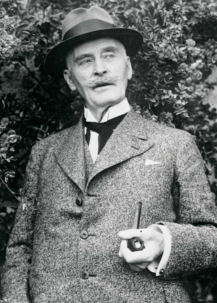 Den norske forfatter Knut Hamsun foran sit landsted kort før 85 års fødselsdagen den 4. august 1944.