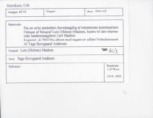 O. B. Henriksen. Fra en billedserie hovedsagelig internerede kommunister. Optaget af fotograf Leni (Helene) Madsen, hustru til den internerede landsretssagfører Carl Madsen. Kopieret år 2002 fra album med negativer udlånt Frihedsmuseet af Tage Revsgaard Andersen.