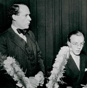 Daværende minister Frode Jacobsen ved en frihedsfest. Bemærk Churchills V-tegr.
