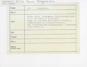 Sporvognsfunktionær Niels Carlo Jørgensen. Født 8. juli 1917. Dræbt den 5. maj 1945. Tilknyttet Militærgrupperne i København, Afsnit 5.