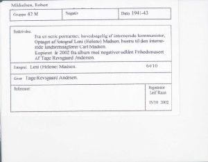 Robert Mikkelsen. Billedet er blandt fotos af hovedsagelig internerede kommunister. Optaget af fotograf Leni (Helene) Madsen, hustru til den internerede landsretssagfører Carl Madsen. Kopieret år 2002 fra album med negativer udlånt Frihedsmuseet af Tage Revsgaard Andersen.