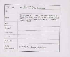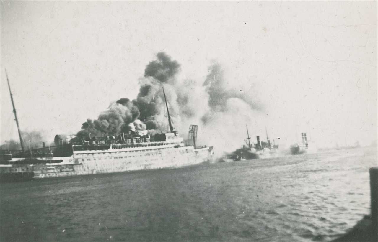 Maskingenkendt tekst fra fotokuvert: Fra Stattendamm, Holland-Amerika liniens skib ses bomberamt tillige med havneanlæg og broer, Rotterdam?