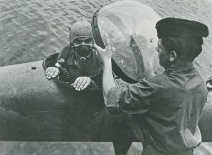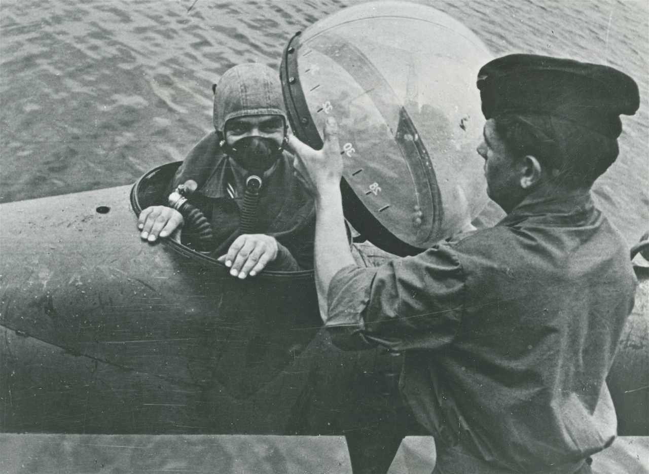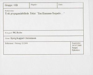 Maskingenkendt tekst fra fotokuvert: Tysk propagandabillede Tekst "Das Einmann-Torpedo....."