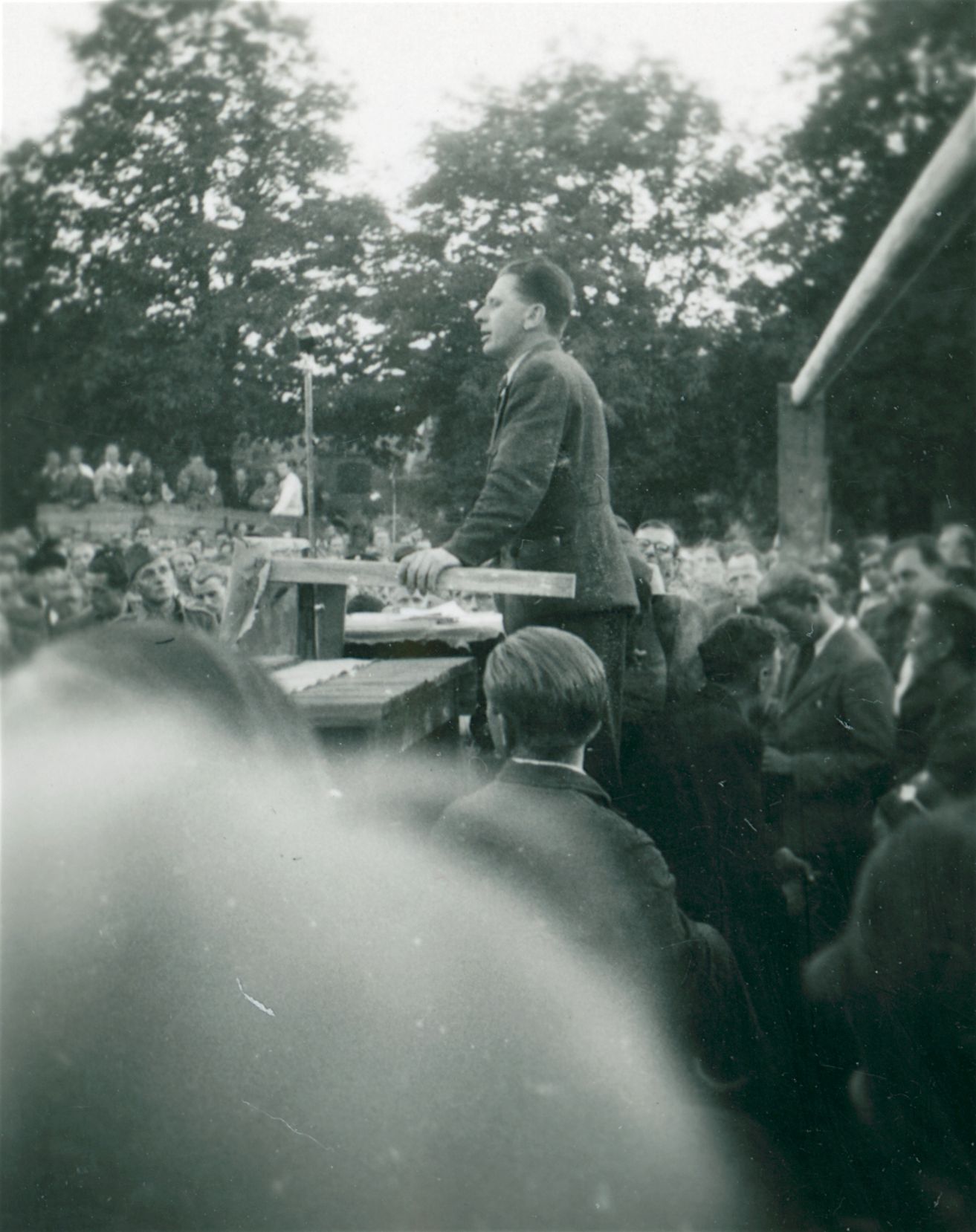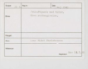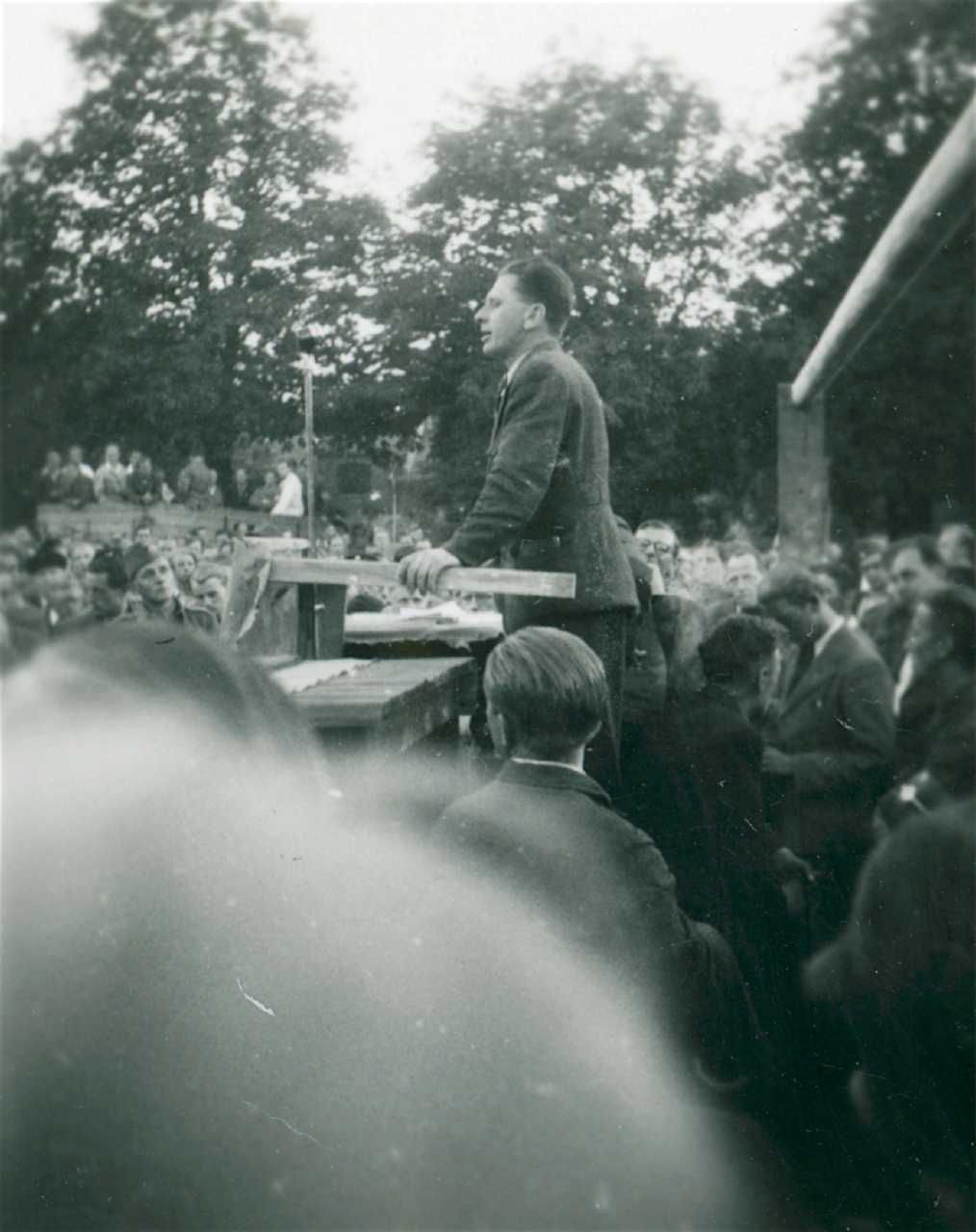 Maskingenkendt tekst fra fotokuvert: Friluftsmøde med taler. Uden stedangivelse.