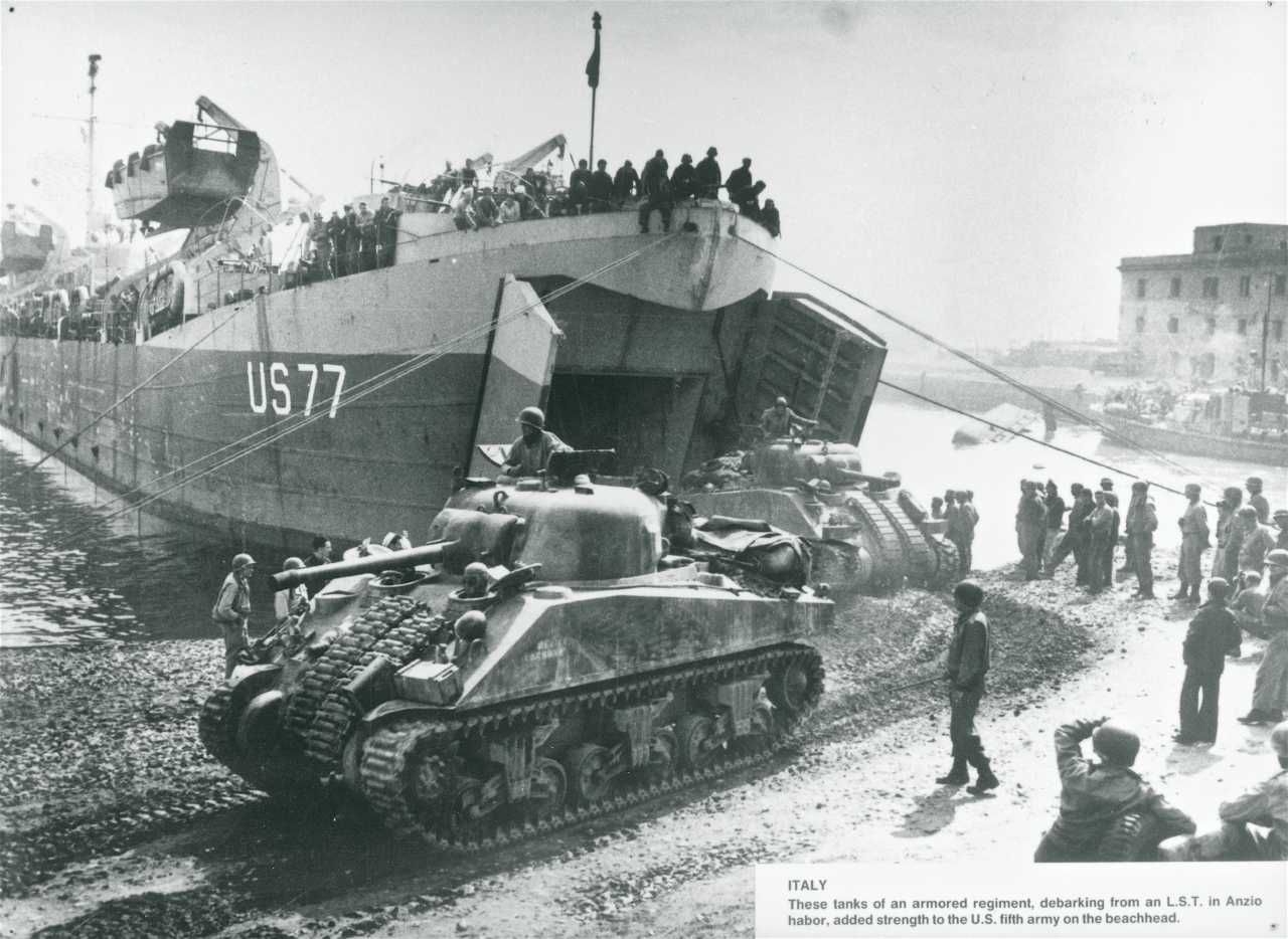 Maskingenkendt tekst fra fotokuvert: Tank kører i land i Anzios havn for at styrke US 5.armé