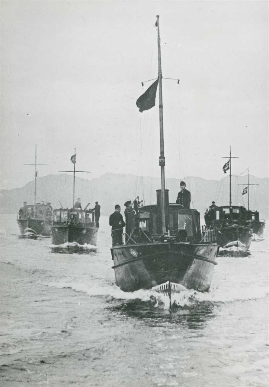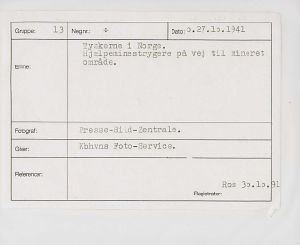 Maskingenkendt tekst fra fotokuvert: Tyskerne i Norge. Hjælpeminestrygere på vej til mineret område.