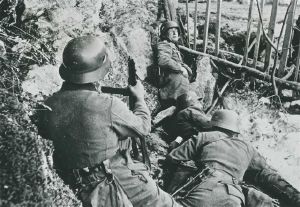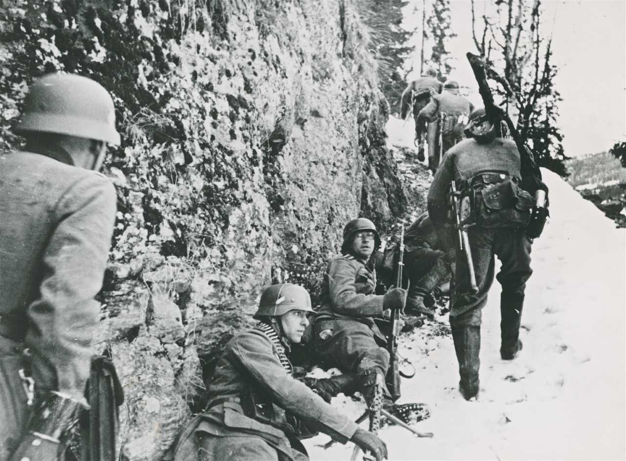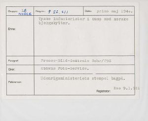 Maskingenkendt tekst fra fotokuvert: Tyske infanterister i kamp mod norske bjergskytter.