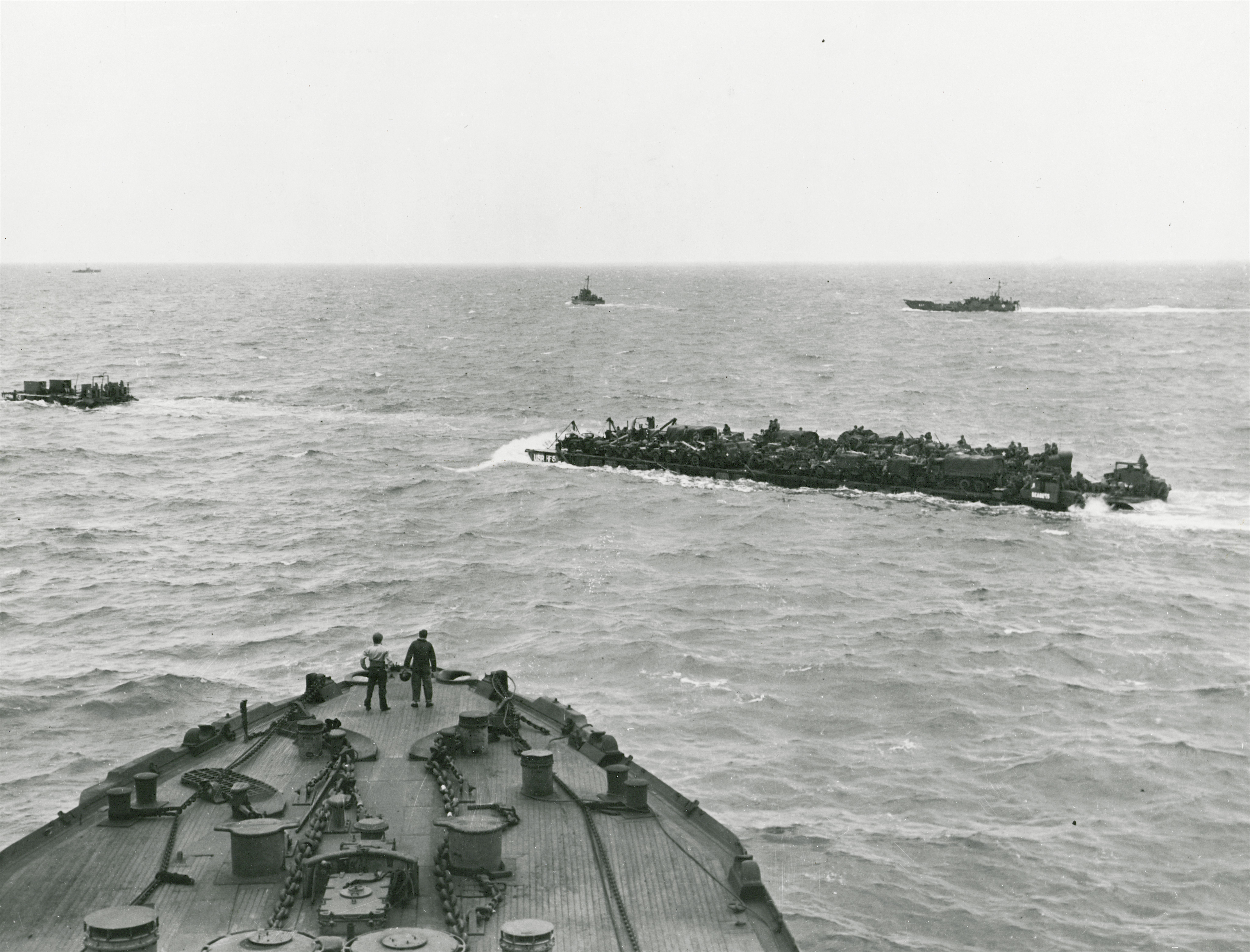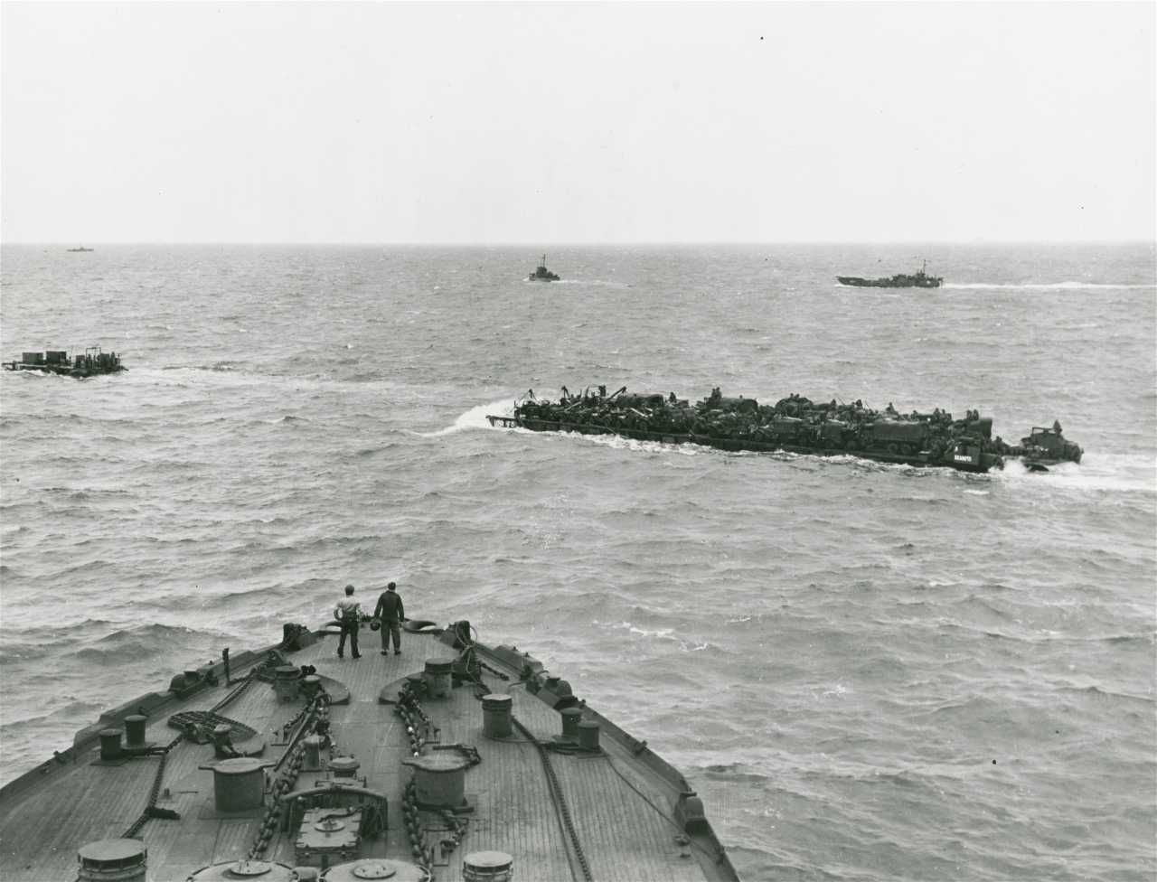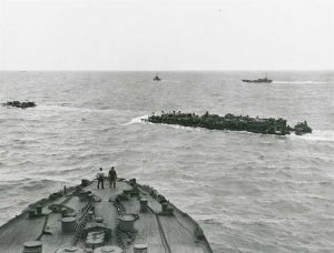 Den 1. bølge af amerikanske tropper i et landgangsfartøj på vej ind mod Normandiet den 6. juni 1944..