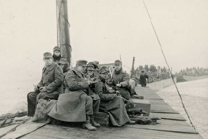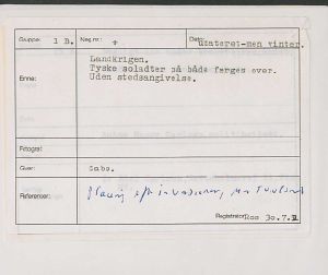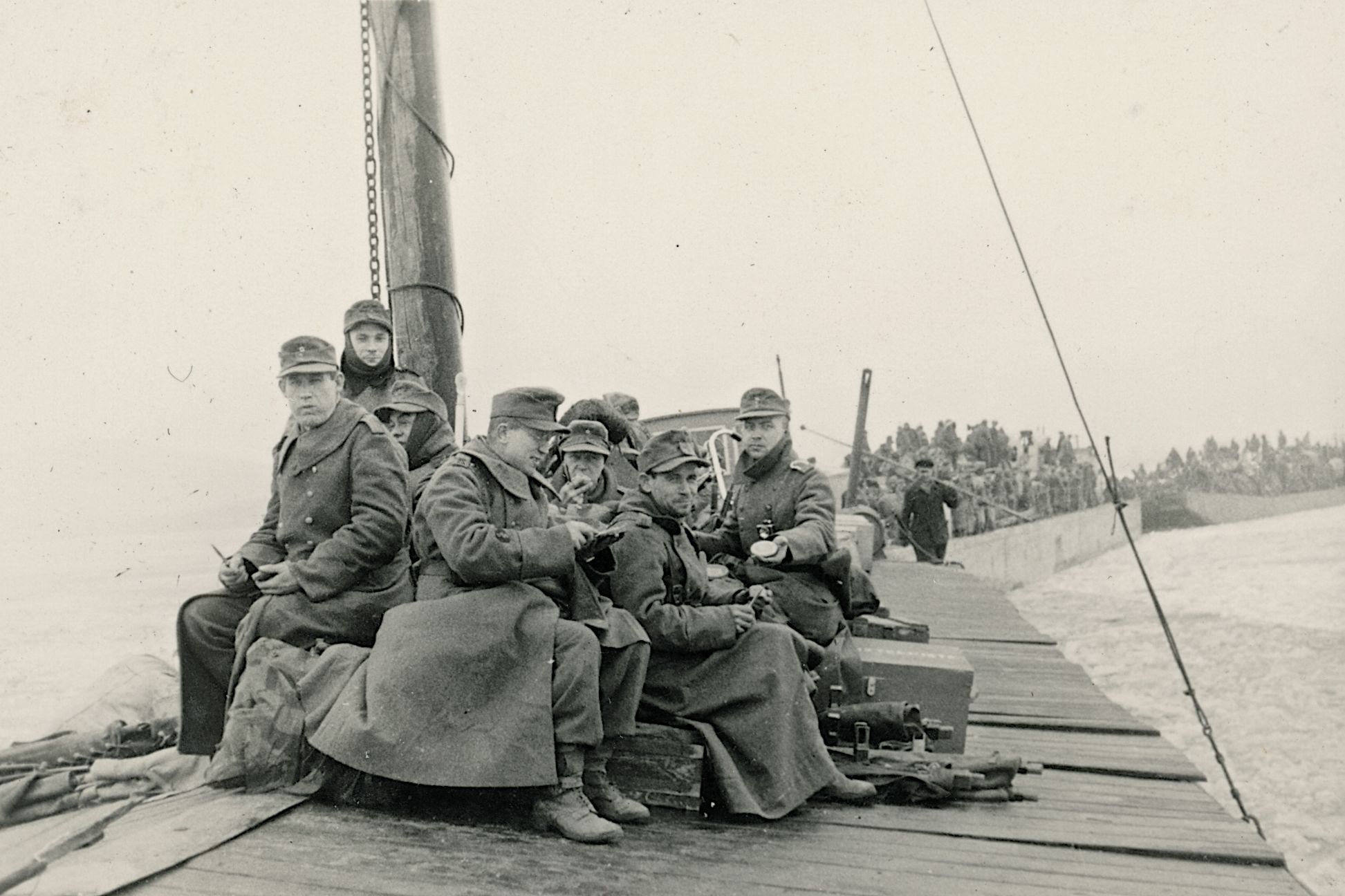Maskingenkendt tekst fra fotokuvert: Landkrigen. Tyske soldater på både færges over. Uden stedsangivelse.