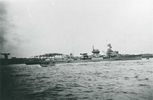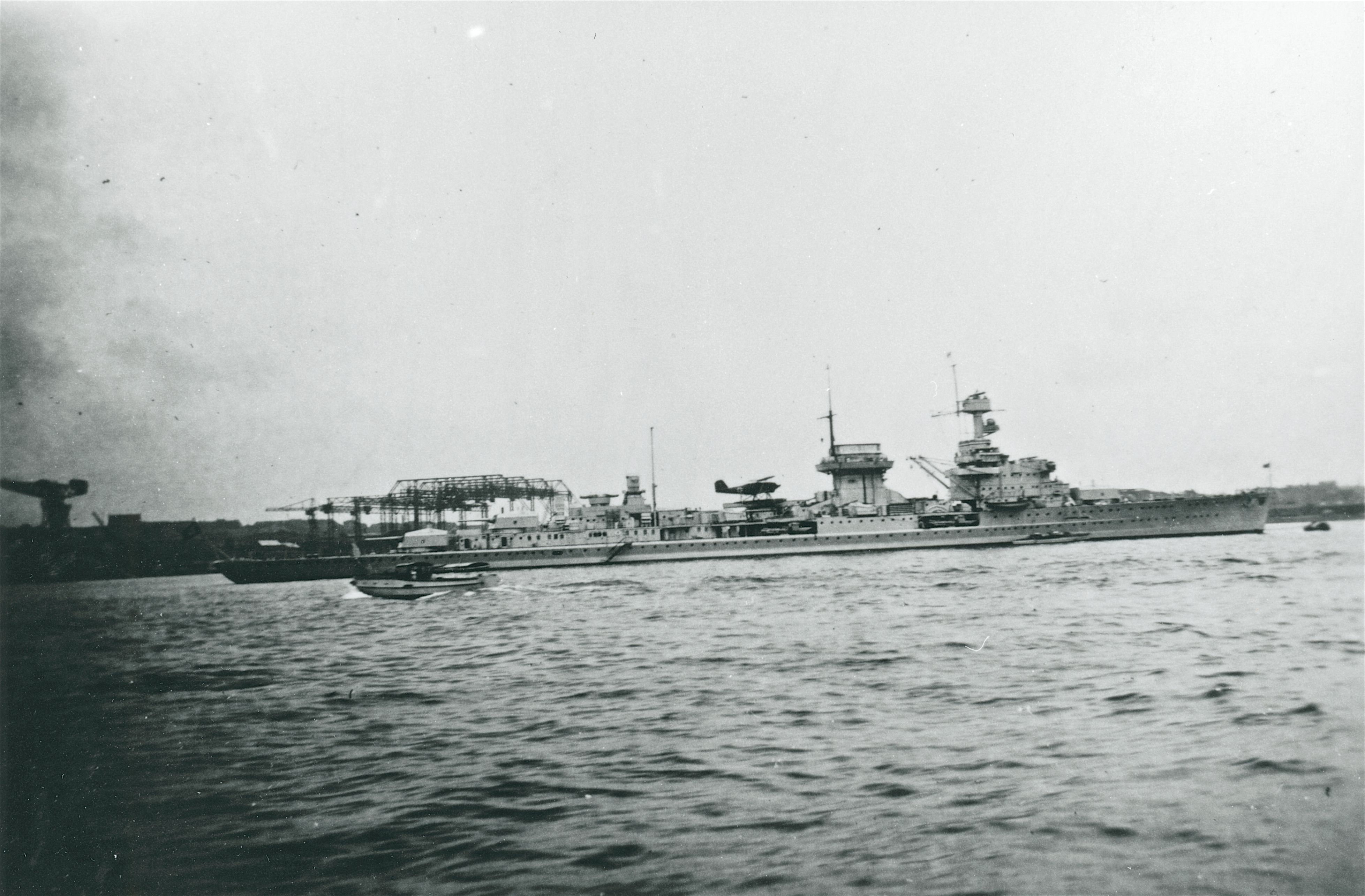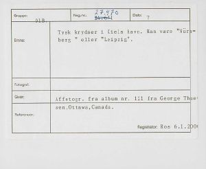 Maskingenkendt tekst fra fotokuvert: Tysk krydser i Kiels havn. Kan være "Nunberg" eller "Leipzig".