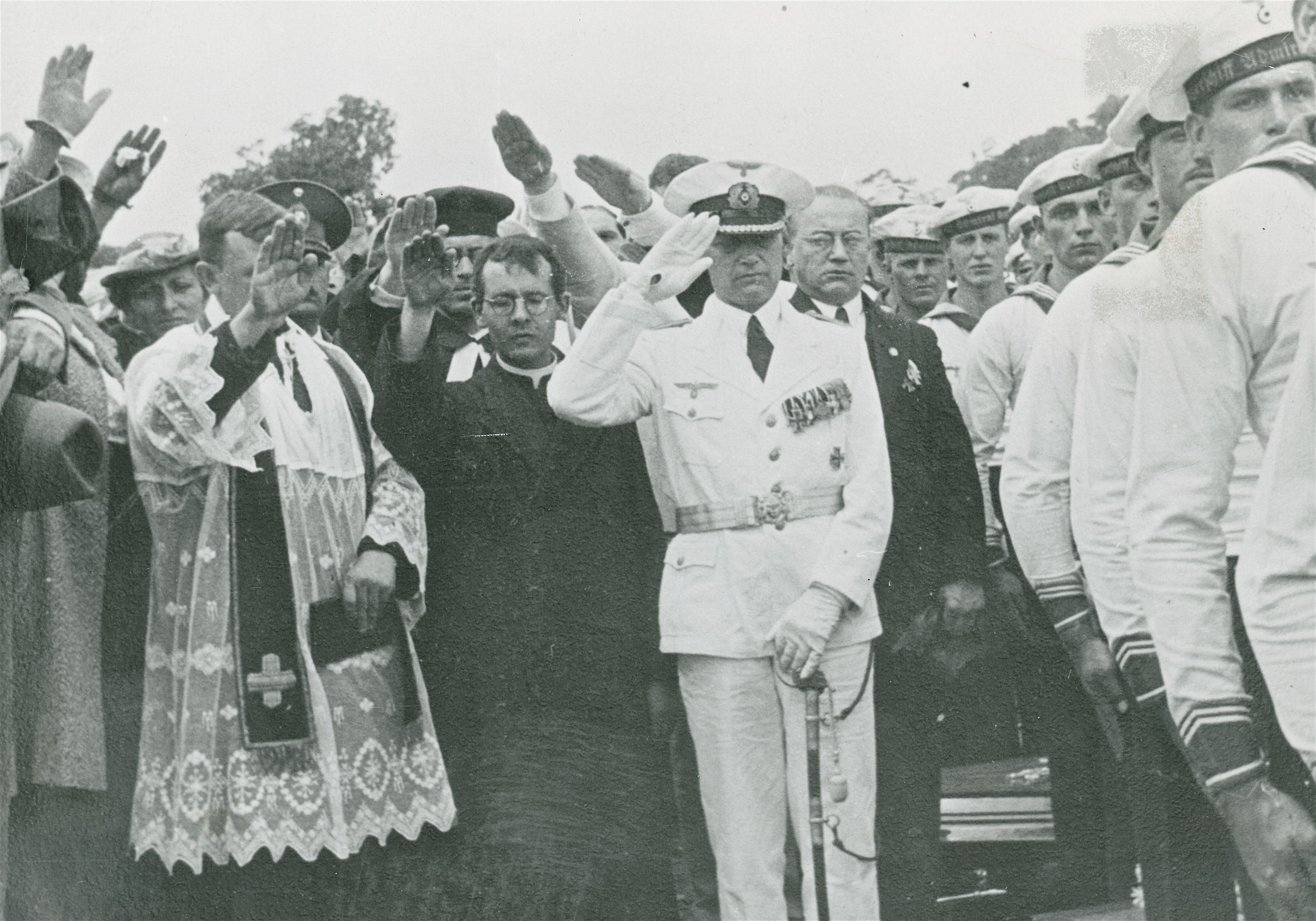 Maskingenkendt tekst fra fotokuvert: Kaptajn Langsdorff ved begravelsen af de 36 faldne fra "Admirrat Spee"