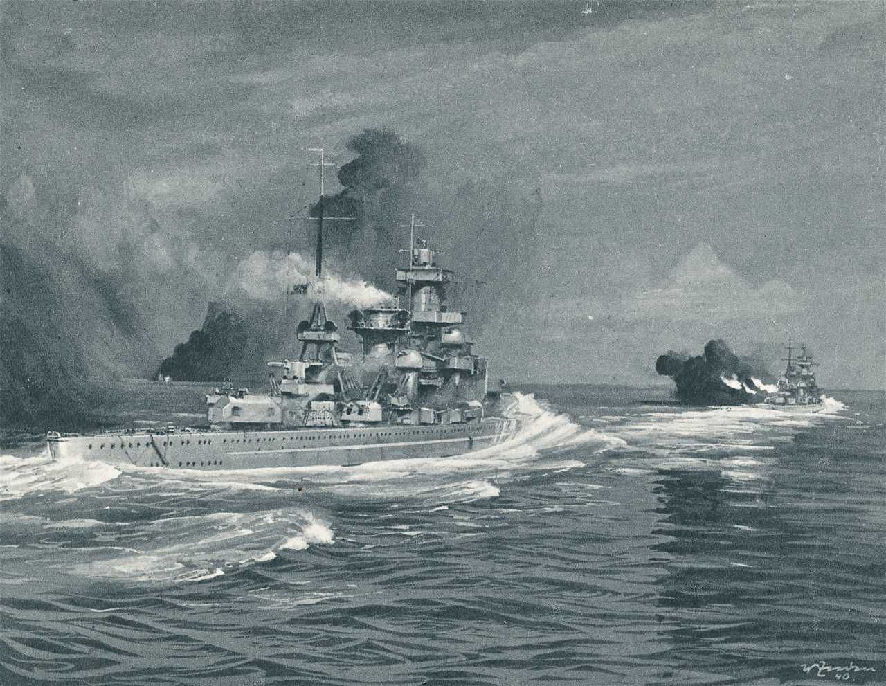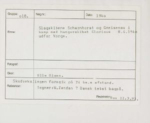 Maskingenkendt tekst fra fotokuvert: Slagskibene Scharnhorst og Gneisenau i kamp med hangarskibet Glorious 8.6.1940 udfor Norge.