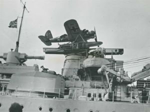 Maskingenkendt tekst fra fotokuvert: Tysk krigsskib. Et tysk fly lige før det bliver afskudt med katapult.