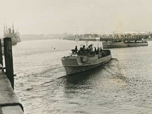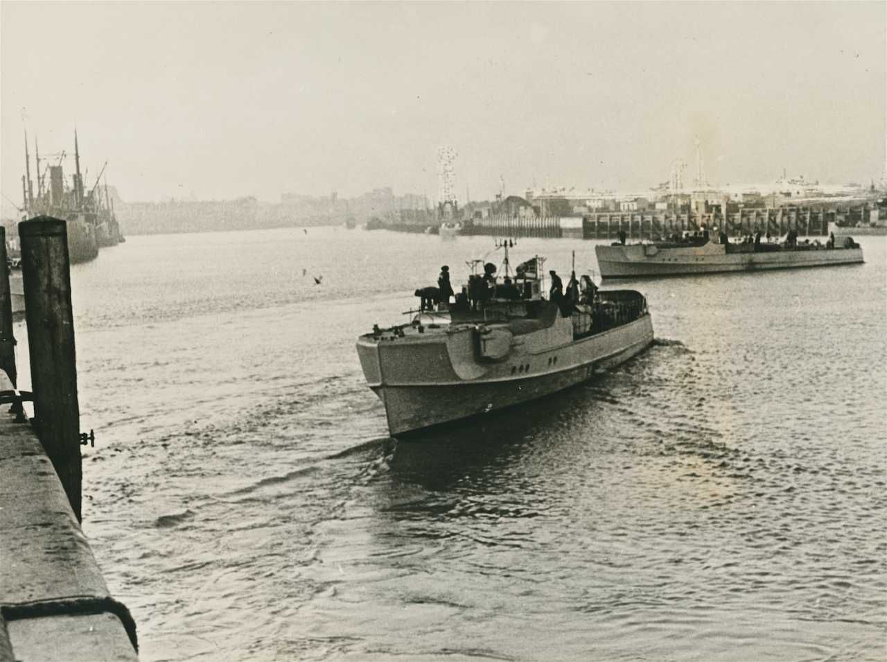 Hurtigbåden bakker og løber så med de andre både i gruppen ud af havnen mod den engelske kyst."