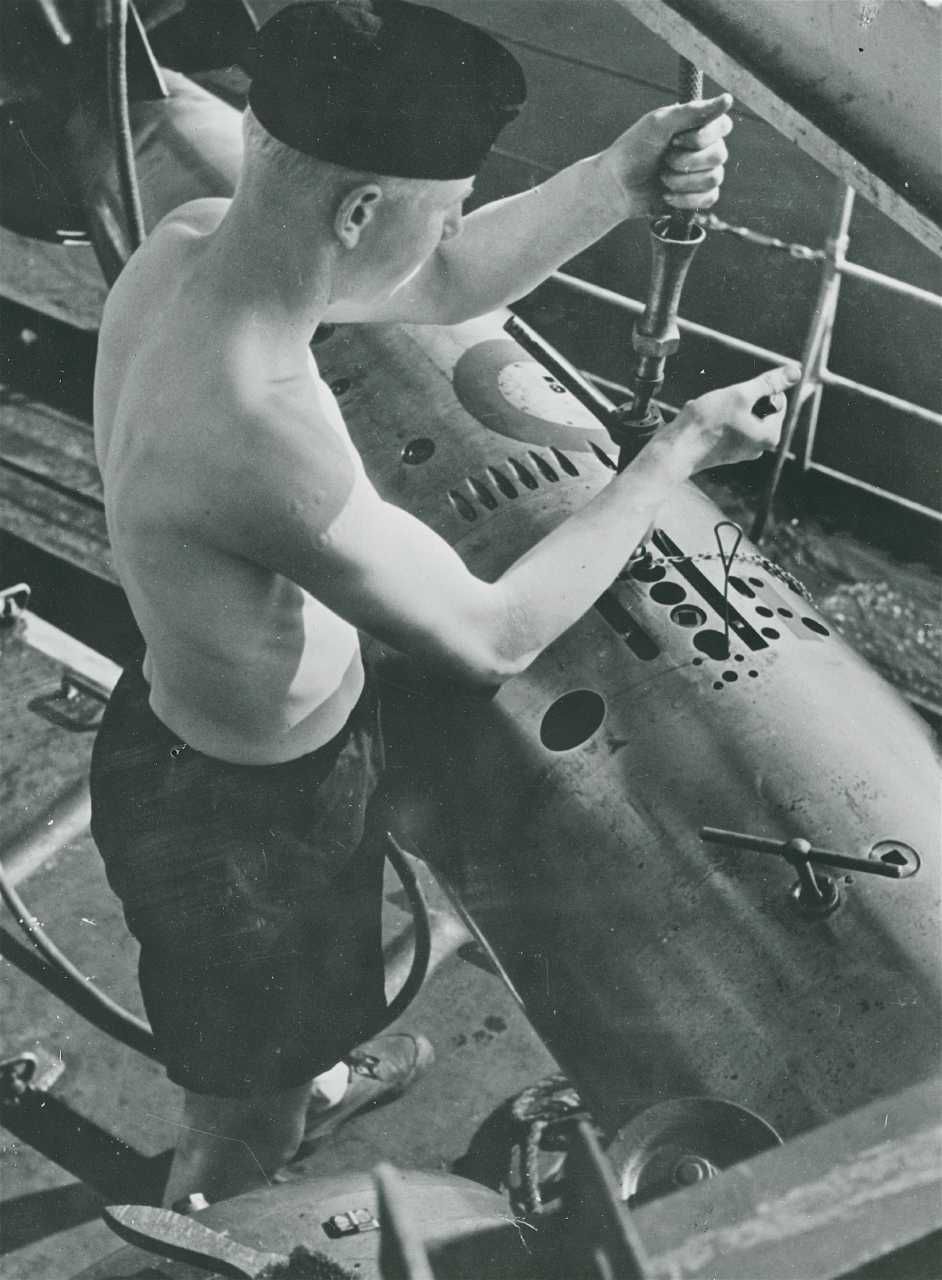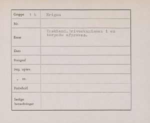 Maskingenkendt tekst fra fotokuvert: Tyskland. Drivemekanismen i en torpedo afprøves.