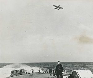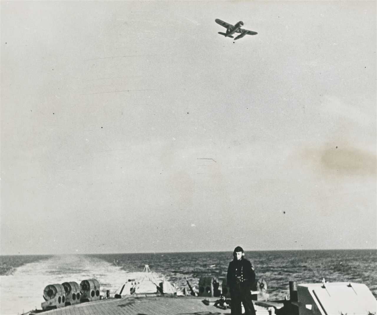 Maskingenkendt tekst fra fotokuvert: Tysk krigsskib. Et opklaringsfly vender tilbage.