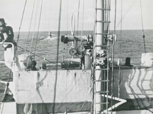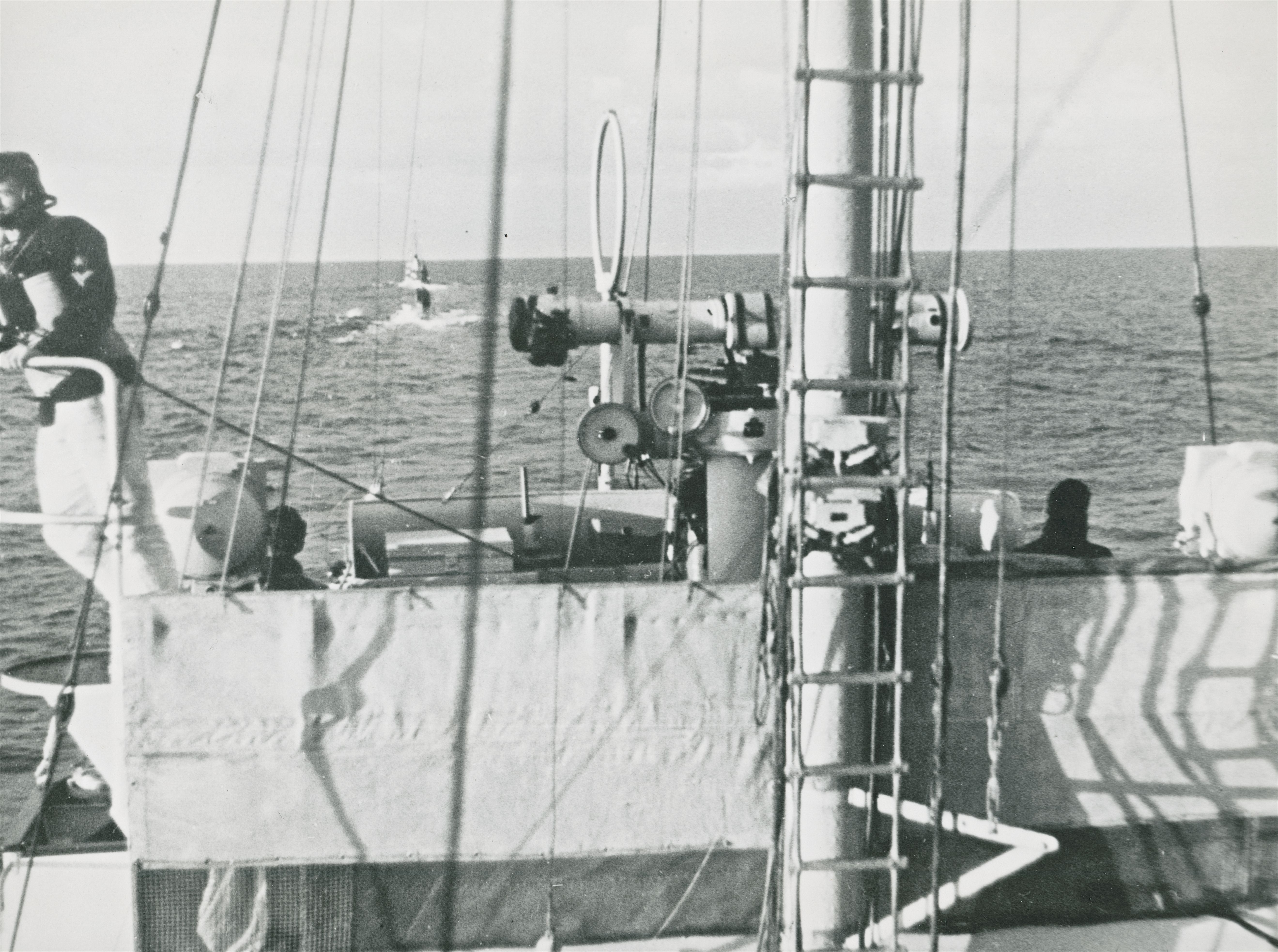 Maskingenkendt tekst fra fotokuvert: Tysk krigsskib. Signalgast holder udkik.