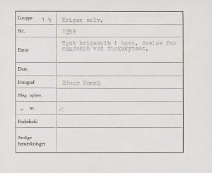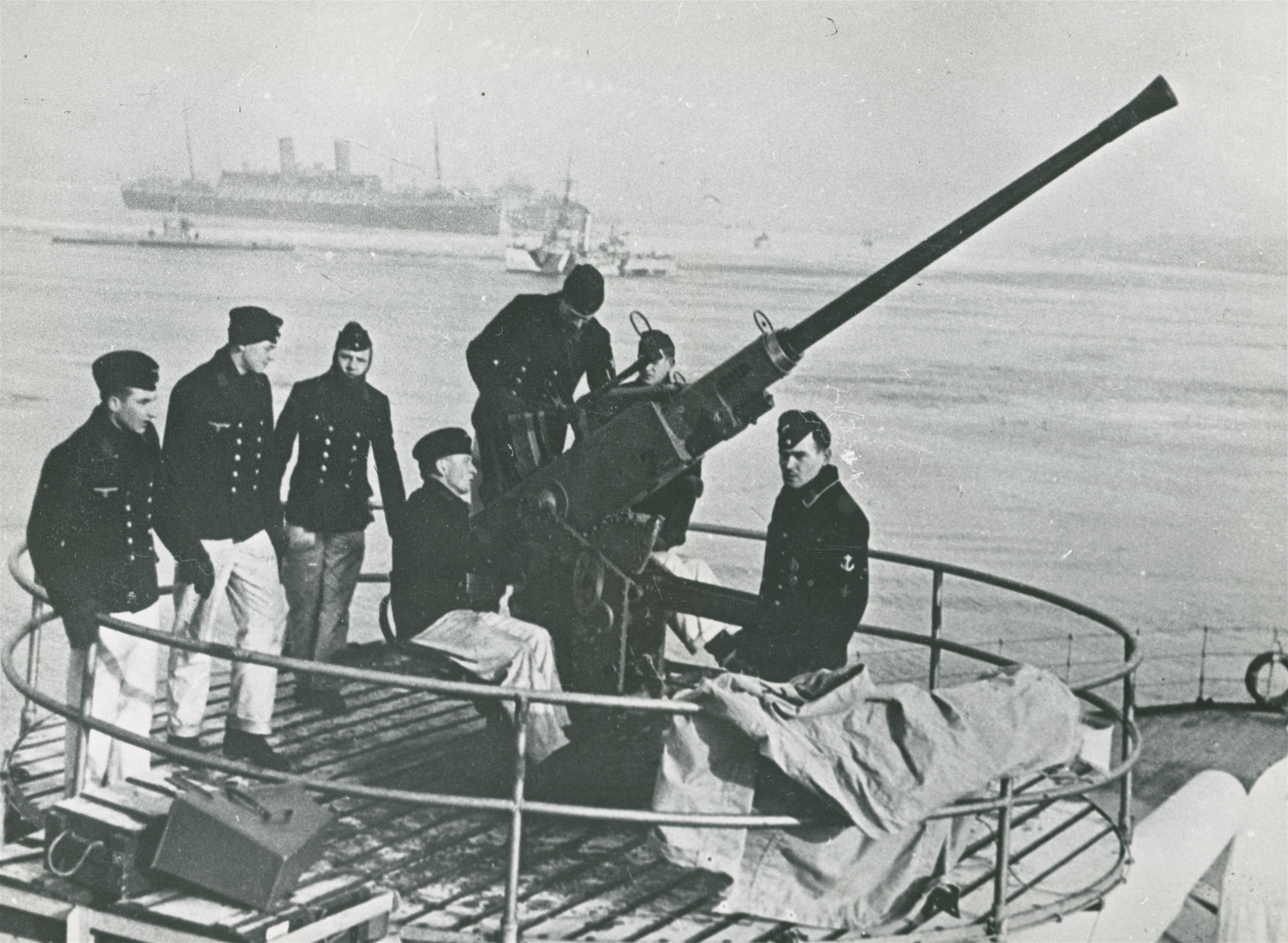 Maskingenkendt tekst fra fotokuvert: Tysk krigsskib i havn. Øvelse for mandskab ved flakskytset.