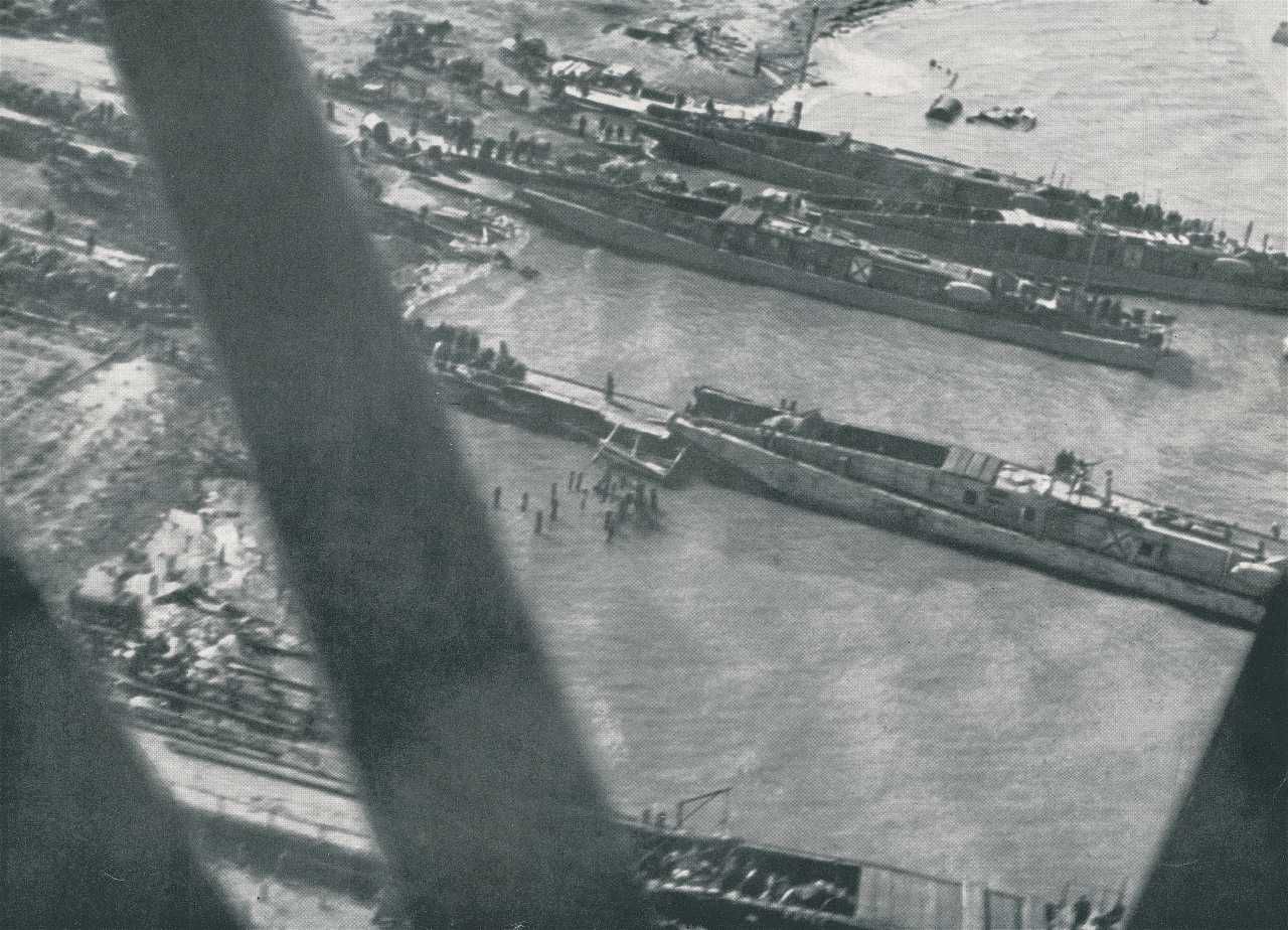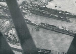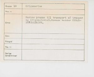 Maskingenkendt tekst fra fotokuvert: Marine pramme til transport af tropper og krigsmateriel. Havnen hedder KUBAN-BRUCKENKOPH.
