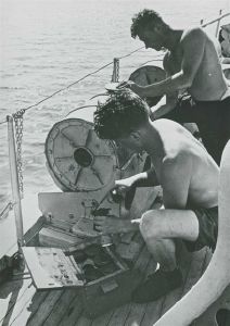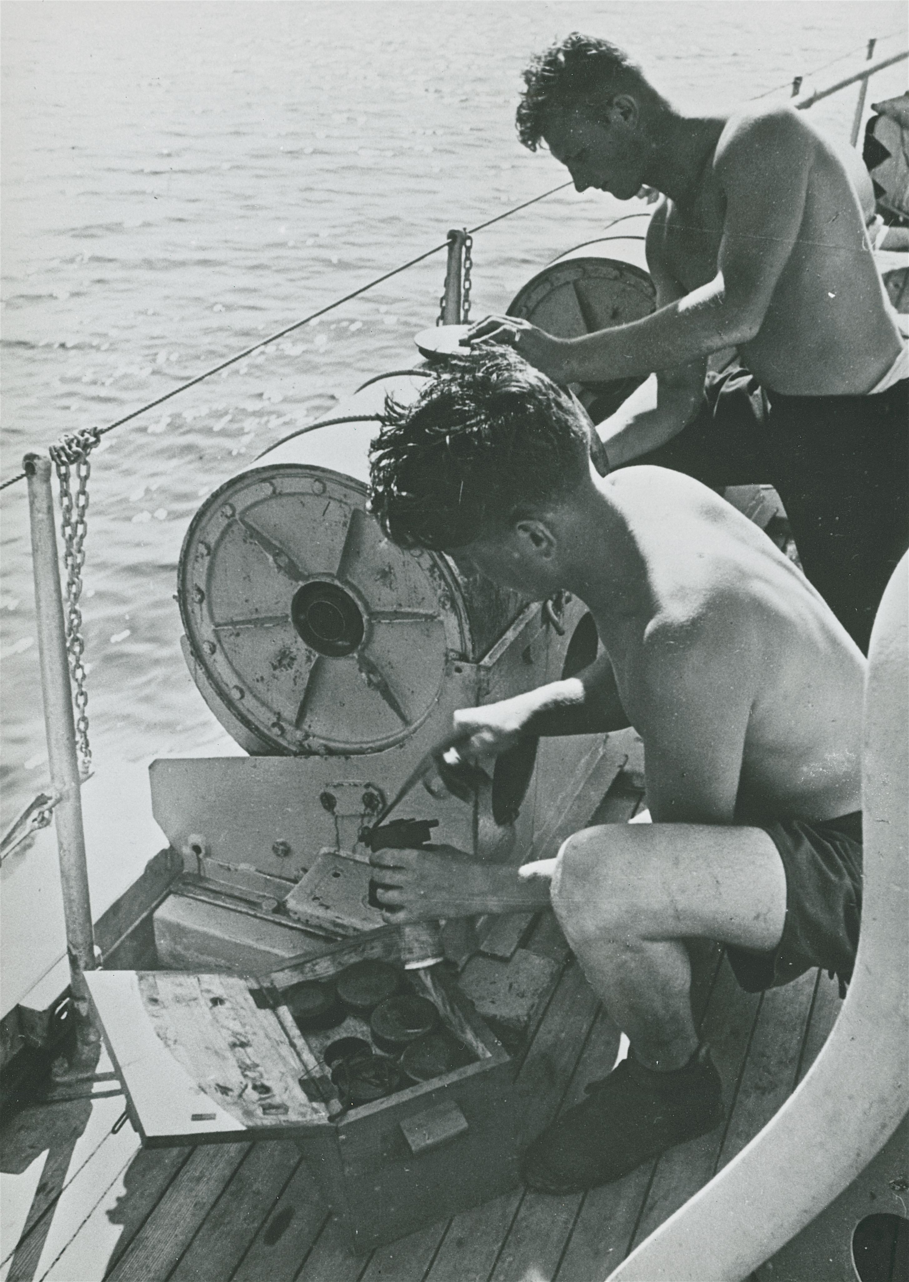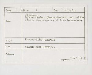 Maskingenkendt tekst fra fotokuvert: Søkrigen. Dybhavsbomber (Wasserbomben) mod u-både bliver klargjort på et tysk krigsskib.