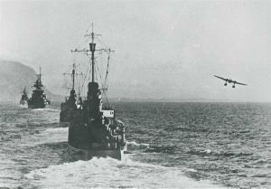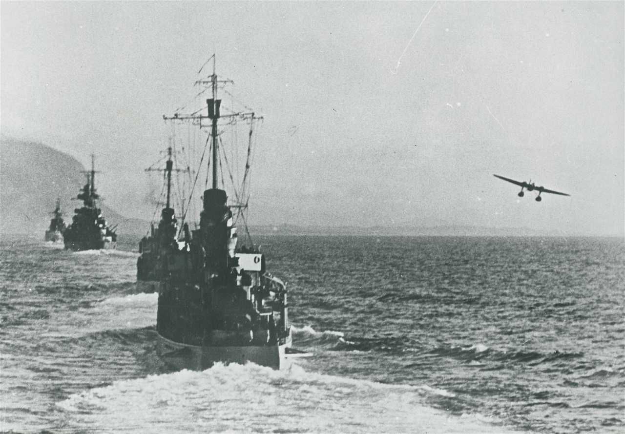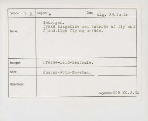 Maskingenkendt tekst fra fotokuvert: Søkrigen. Tyske slagskibe med eskorte af fly mod fjendtlige fly og u-både.