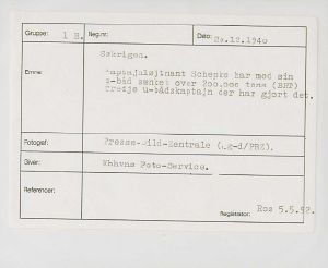 Maskingenkendt tekst fra fotokuvert: Søkrigen. Kaptajnløjtnant Schepke har med sin u-båd sænket over 200. 000 tons (BRT) Tredje u-bådskaptajn der har gjort det