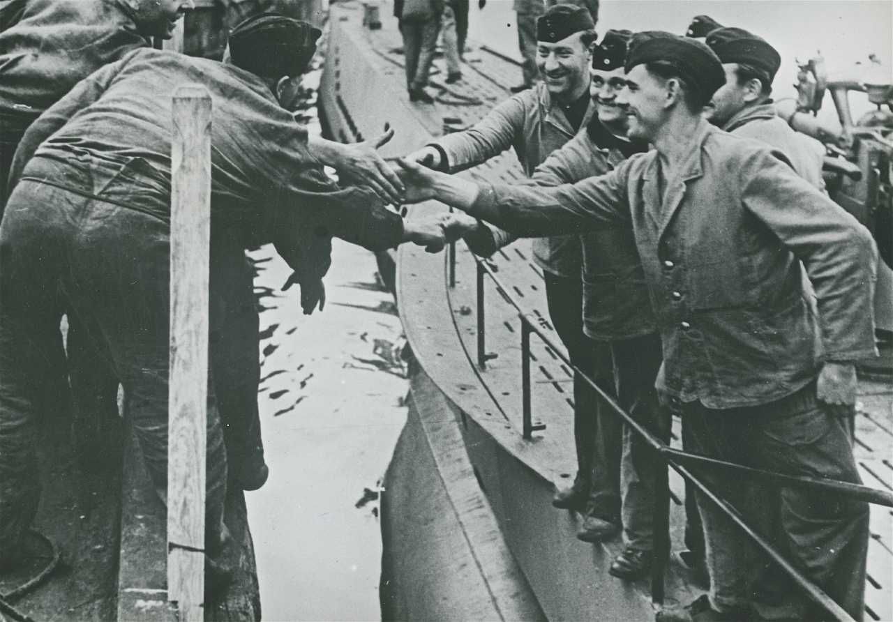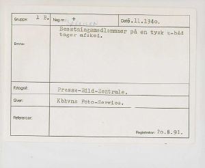 Maskingenkendt tekst fra fotokuvert: Besætningsmedlemmmer på en tysk u-båd tager afsked.