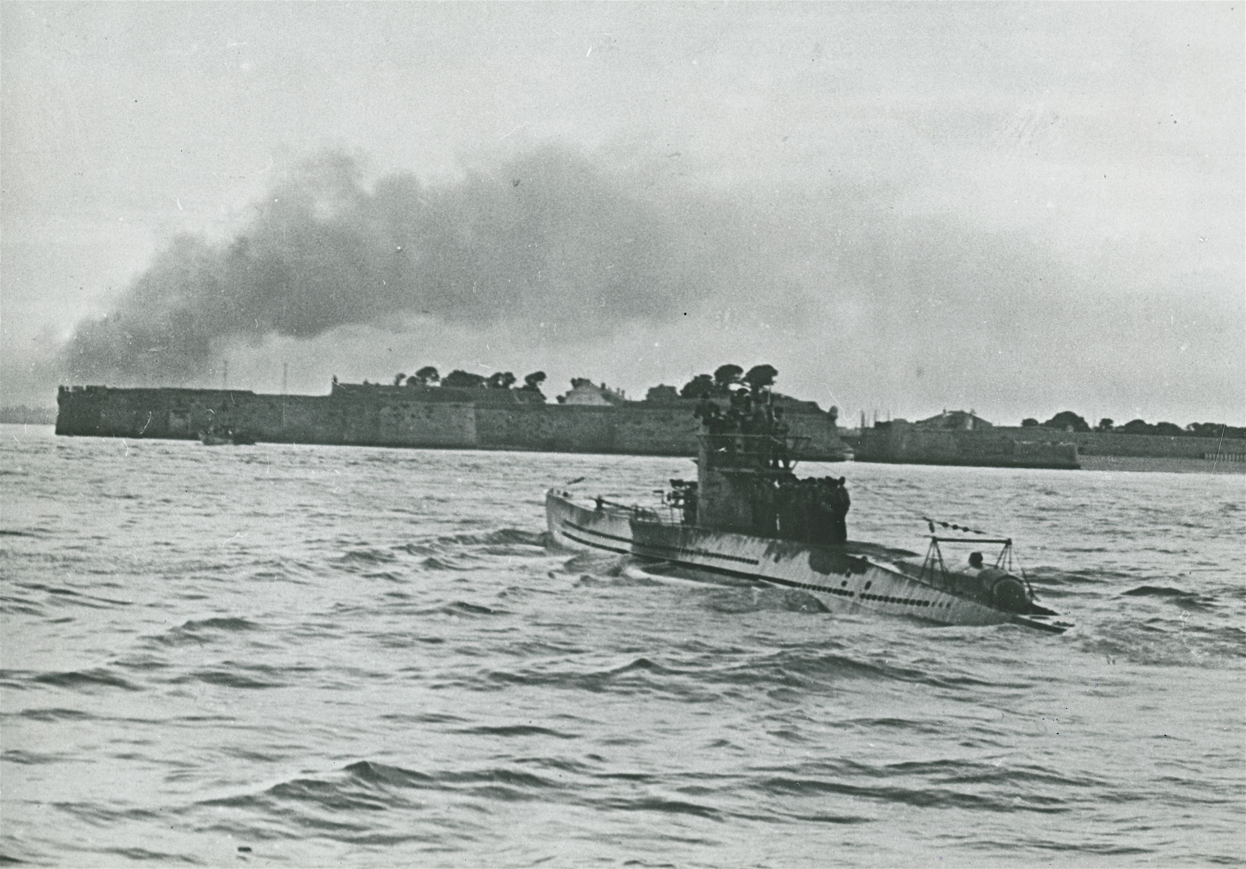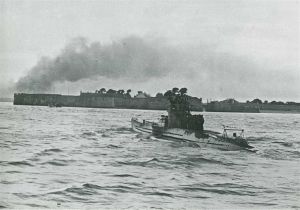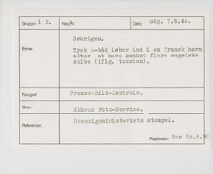 Maskingenkendt tekst fra fotokuvert: Søkrigen. Tysk u-båd løber ind i en fransk havn efter at have sænket flere engelske skibe