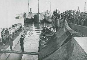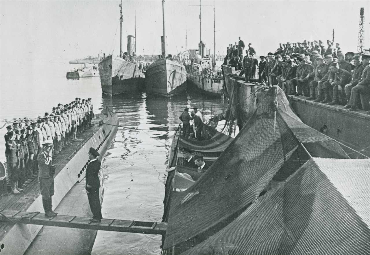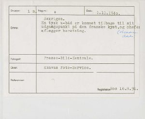 Maskingenkendt tekst fra fotokuvert: Søkrigen. En tysk u-båd er kommet tilbage til sit udgamgspunkt på den franske kyst, og chefen aflægger beretning.