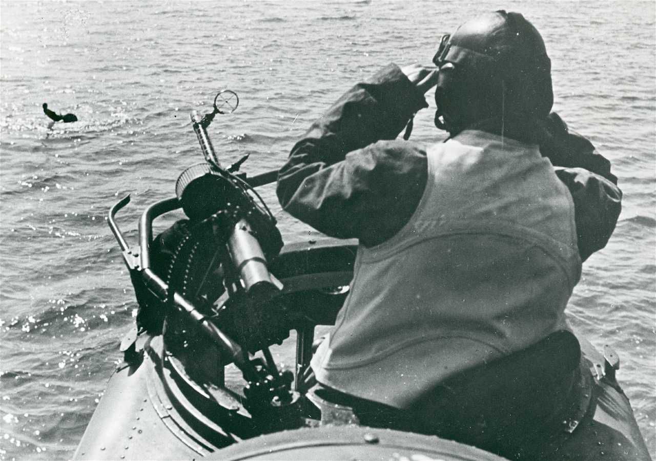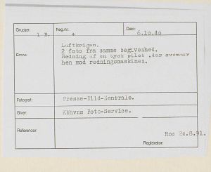 Maskingenkendt tekst fra fotokuvert: Luftkrigen. Redning af en tysk pilot, der svømmer hen mod redningsmaskinen.