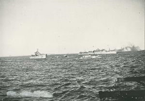 Maskingenkendt tekst fra fotokuvert: Italien. Invasionen på Sicilien. Engelske krigsskibe bringer tropper, tanks og våben.