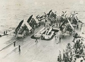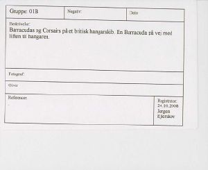 Maskingenkendt tekst fra fotokuvert: Barracudas og Corsairs på et britisk hangarskib. En Barracuda på vej med liften til hangaren.