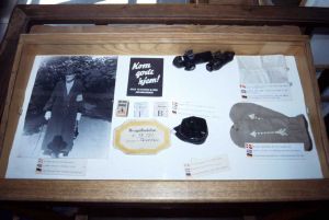 Foto fra systematisk gennemfotografering af udstillingens første del i sommeren 1984, efter at denne var blevet delvis omlagt i perioden 1/12 1983 - 9/4 1984, hvor udstillingen havde været lukket i forbindelse med etablering af en underjordisk tilbygning. Montre om mørklægning.