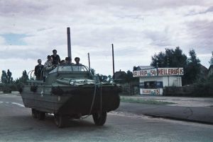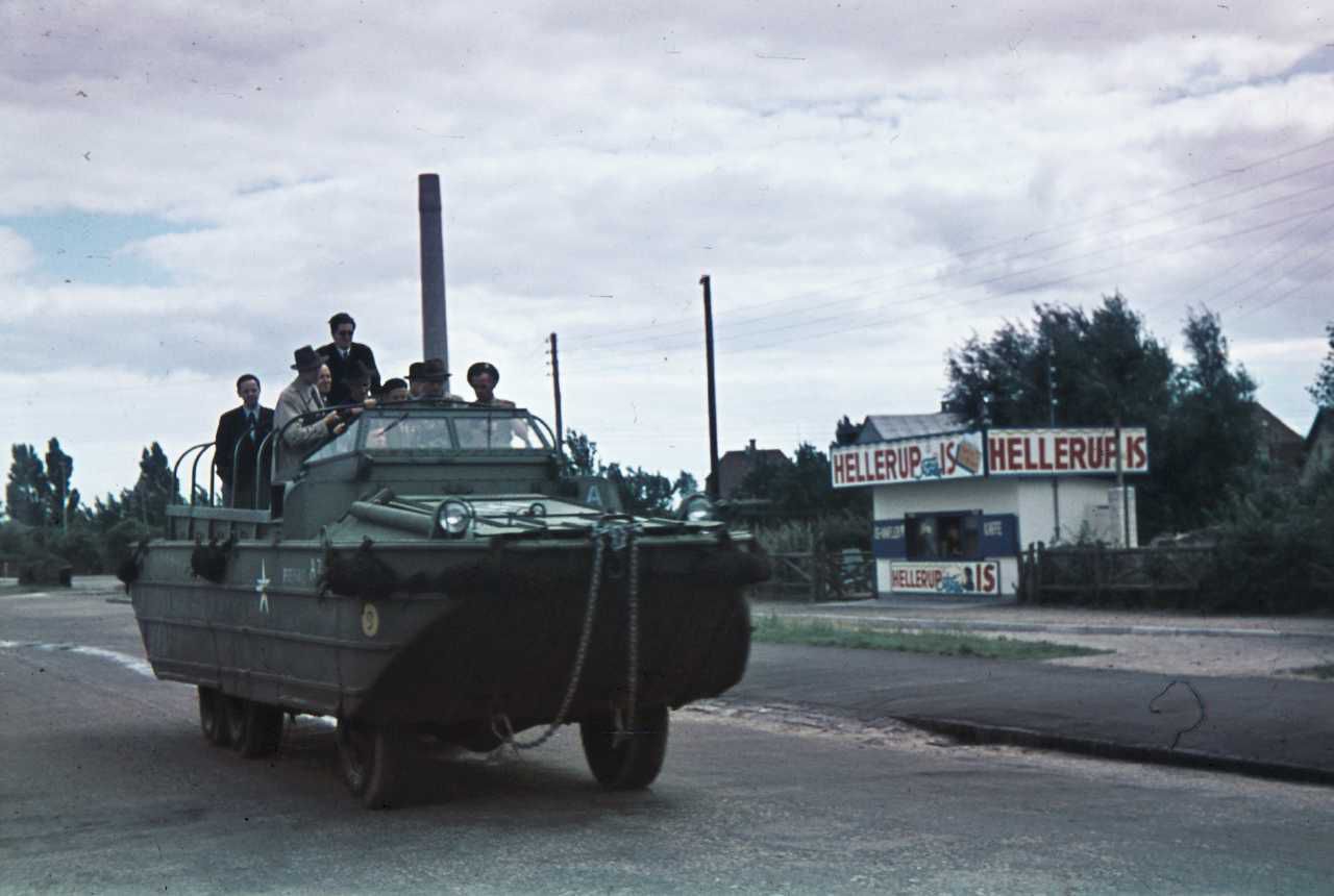 Amerikansk amfibiekøretøj. På køretøjet ses flere civile, måske pressefolk.