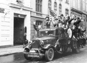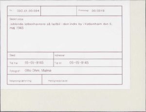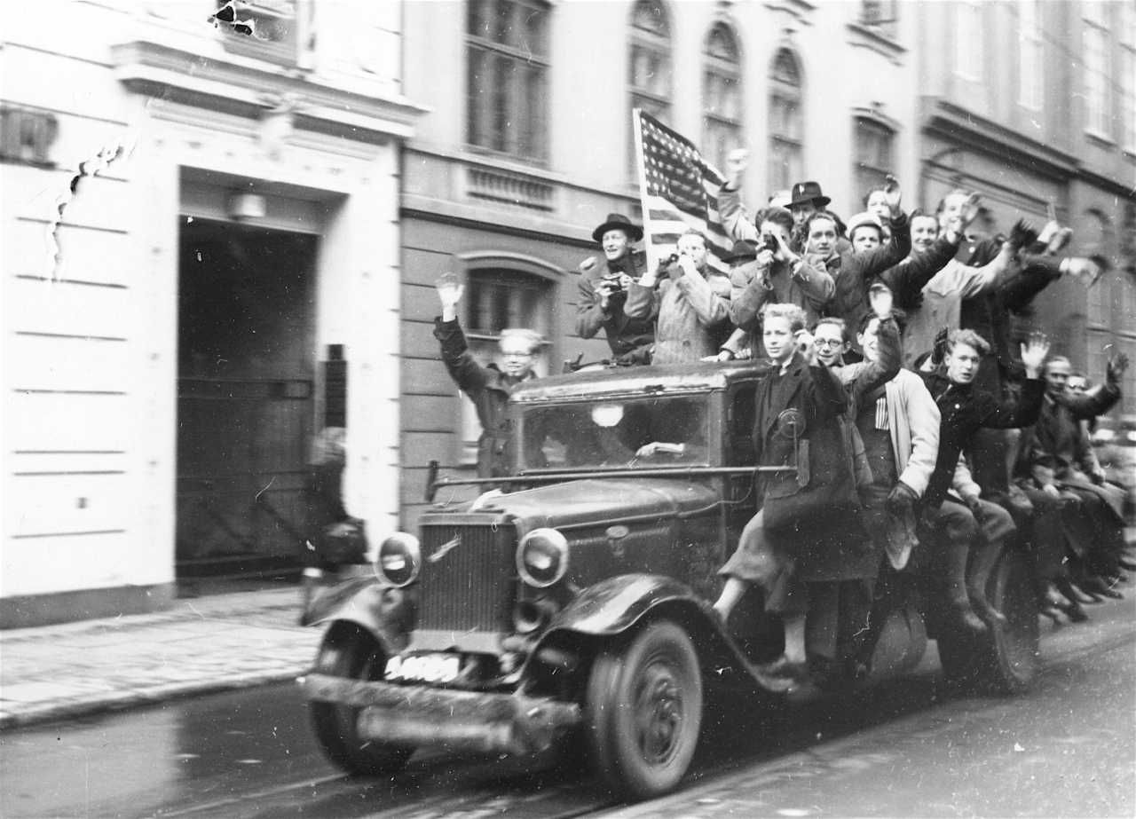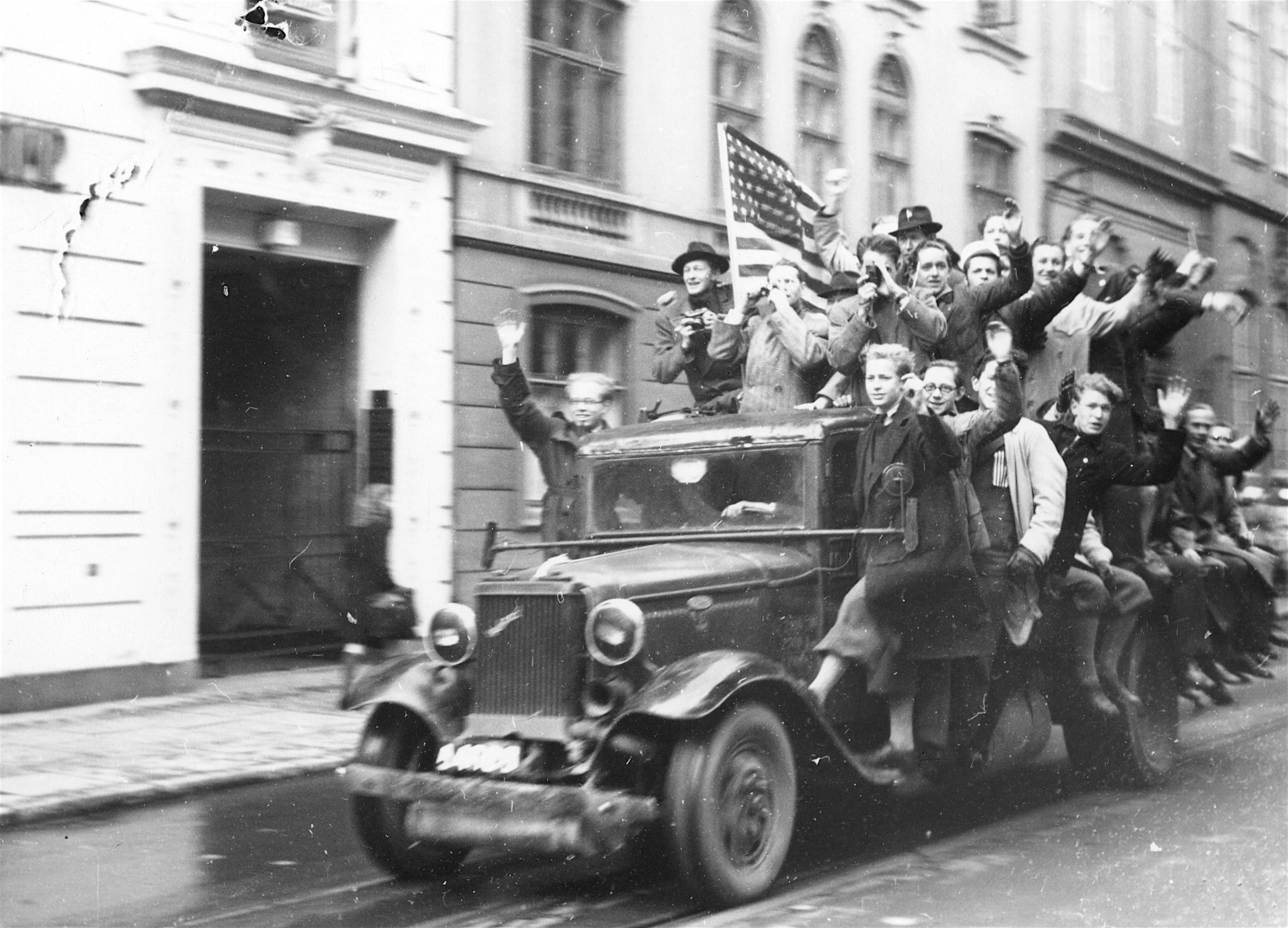 Jublende københavnere på lastbil i den indre by i København den 5. maj 1945