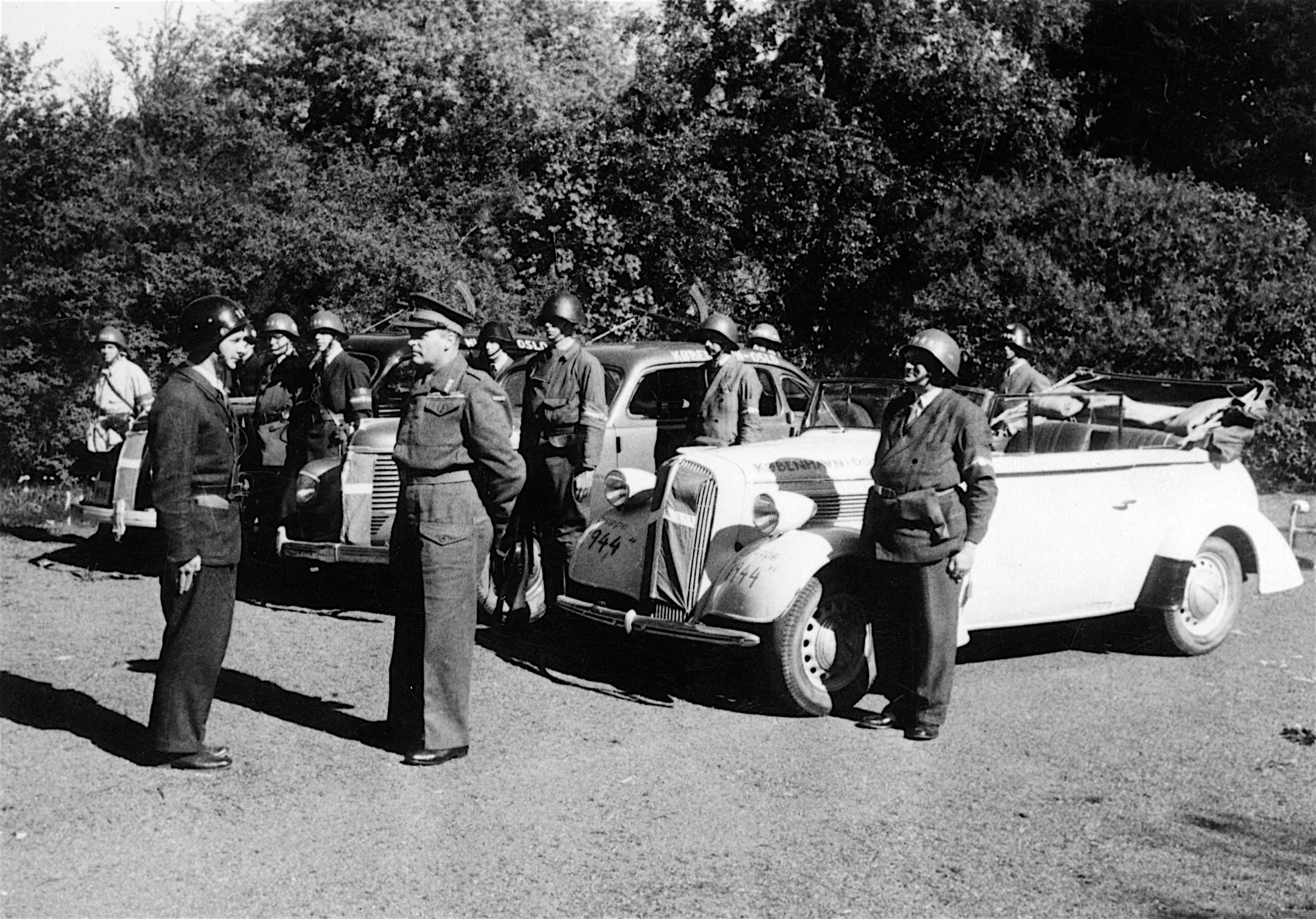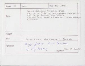 Maskingenkendt tekst fra fotokuvert: Dansk Sabotageforening 1944 Kronprins Olav og den danske delegation med Børge Jensen som leder. Kronprinsen skulle have et frihedskæmpe armbind.