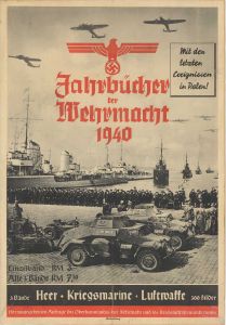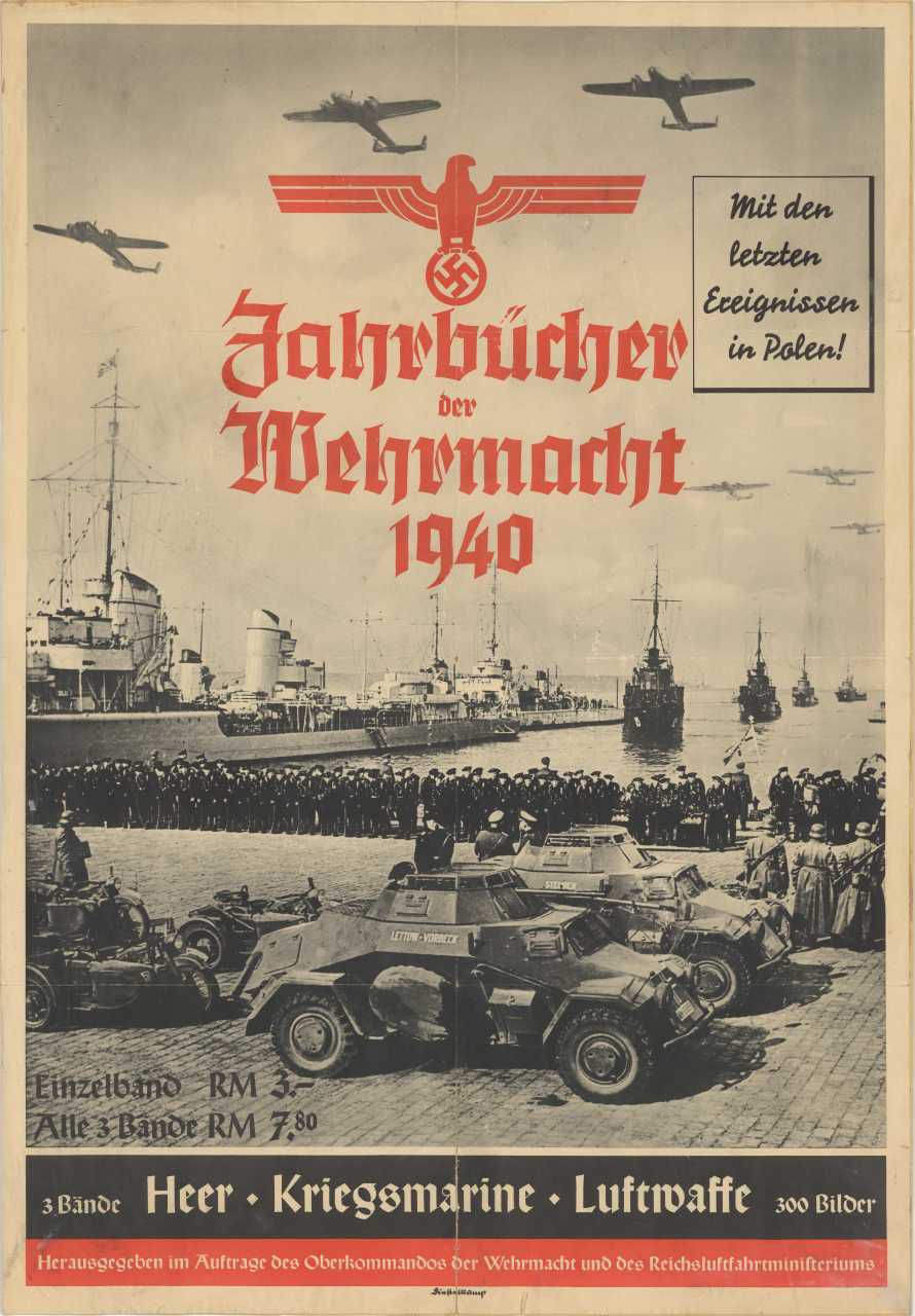 Tysk propagandaplakat med reklame for "Jahrbücher der Wehrmacht 1940" i 3 bind, omhandlende bl.a. Polens-felttoget. 53*76 cm.