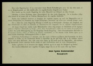 Det flyveblad - OPROP - som blev nedkastet over Danmark i forbindelse med den tyske besættelse 9. april 1940. Underskriveren general Kaupisch var øverstkommanderende for de tyske angrebsstyrker. (Bagside)