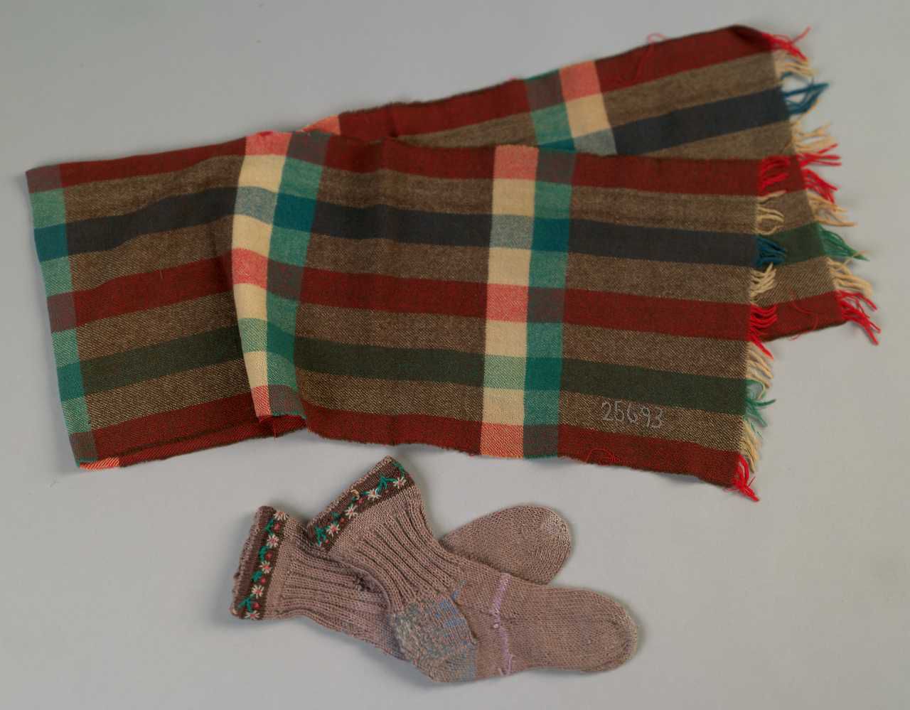Foto optaget i forbindelse med CAMP2-projektet 1998-2000: Halstørklæde og sokker brugt af kvindelig dansk fange i koncentrationslsjren Ravensbrück.