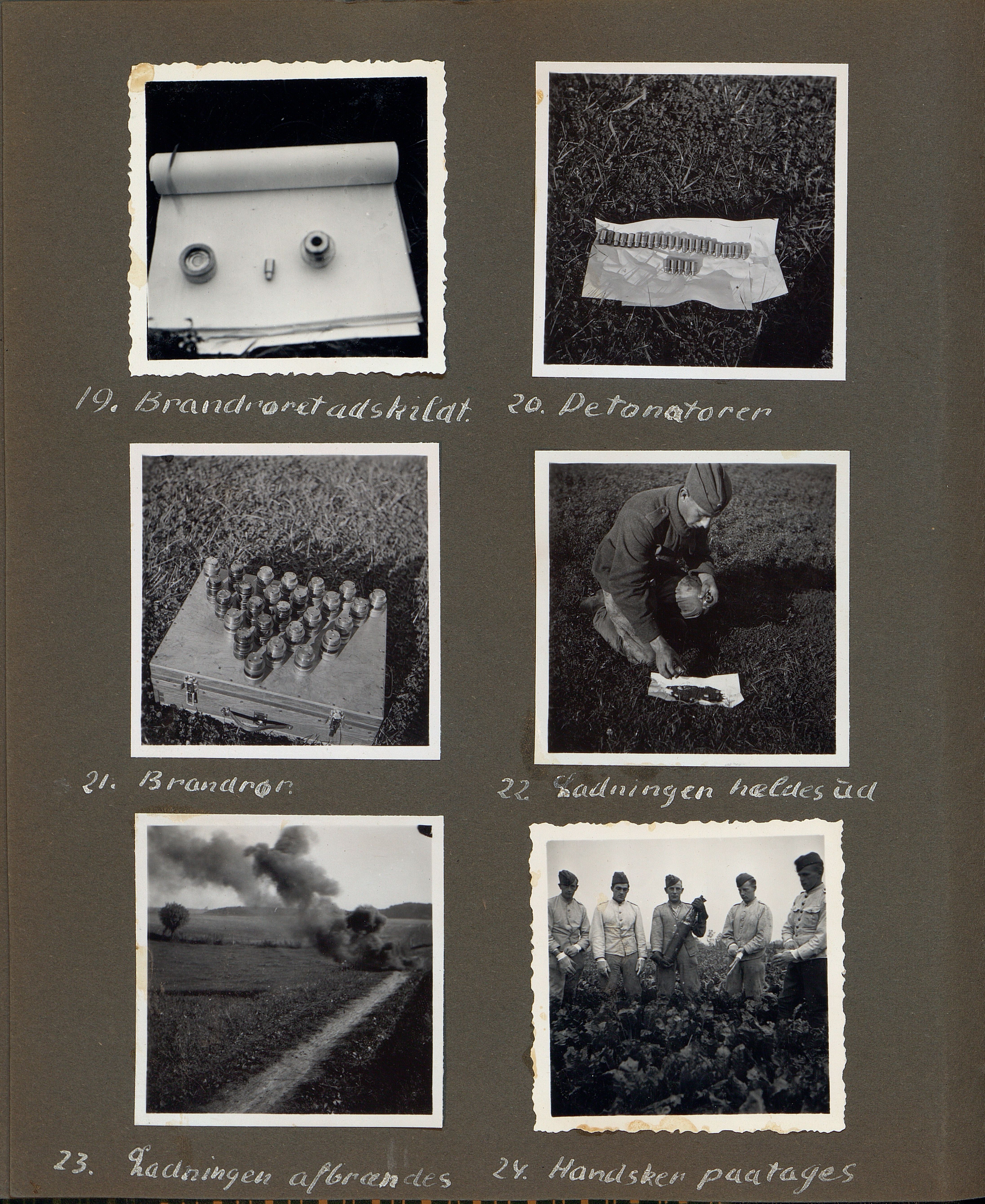 Enkeltside fra fotoalbum med omkring 80 fotos af blindgængere og forsagere, samt deres opgravning og demontering. Hovedsagligt fra det civile luftværn.
