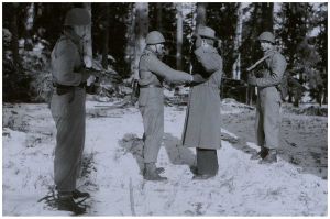 Enkeltfoto fra album med fotos af Den danske brigades ordenspolitiforlægning i Ryds-Bruun samt det danske gesandtskabs afdeling for politianliggender/ordenspolitiet i Stockholm, Göteborg, Helsingborg og Malmö. Dertil fotos af plantegninger og kort.