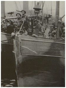 Enkeltfoto fra album med fotos fra Den danske brigade. Viser bl.a. behandlingen af bortdragende tyske soldater ved grænsen.