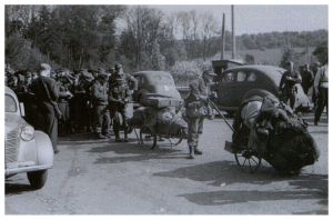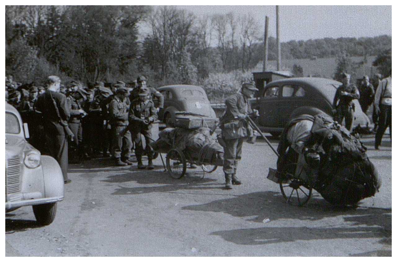 Enkeltfoto fra album med fotos fra Den danske brigade. Viser bl.a. behandlingen af bortdragende tyske soldater ved grænsen.