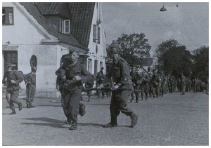 Enkeltfoto fra album med fotos fra Den danske brigade. Viser bl.a. behandlingen af bortdragende tyske soldater ved grænsen.