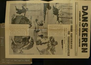 Enkeltside fra fotoalbum med fotos og udklip fra Den danske brigade i Håtunaholm