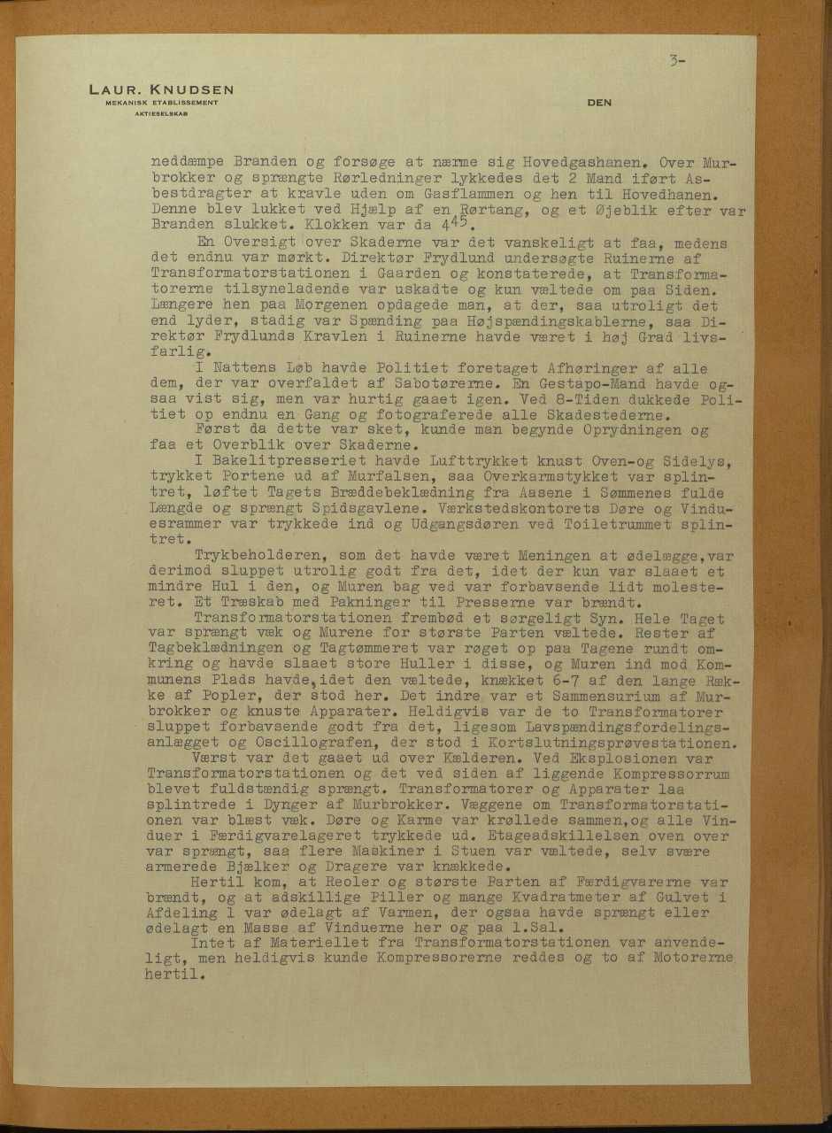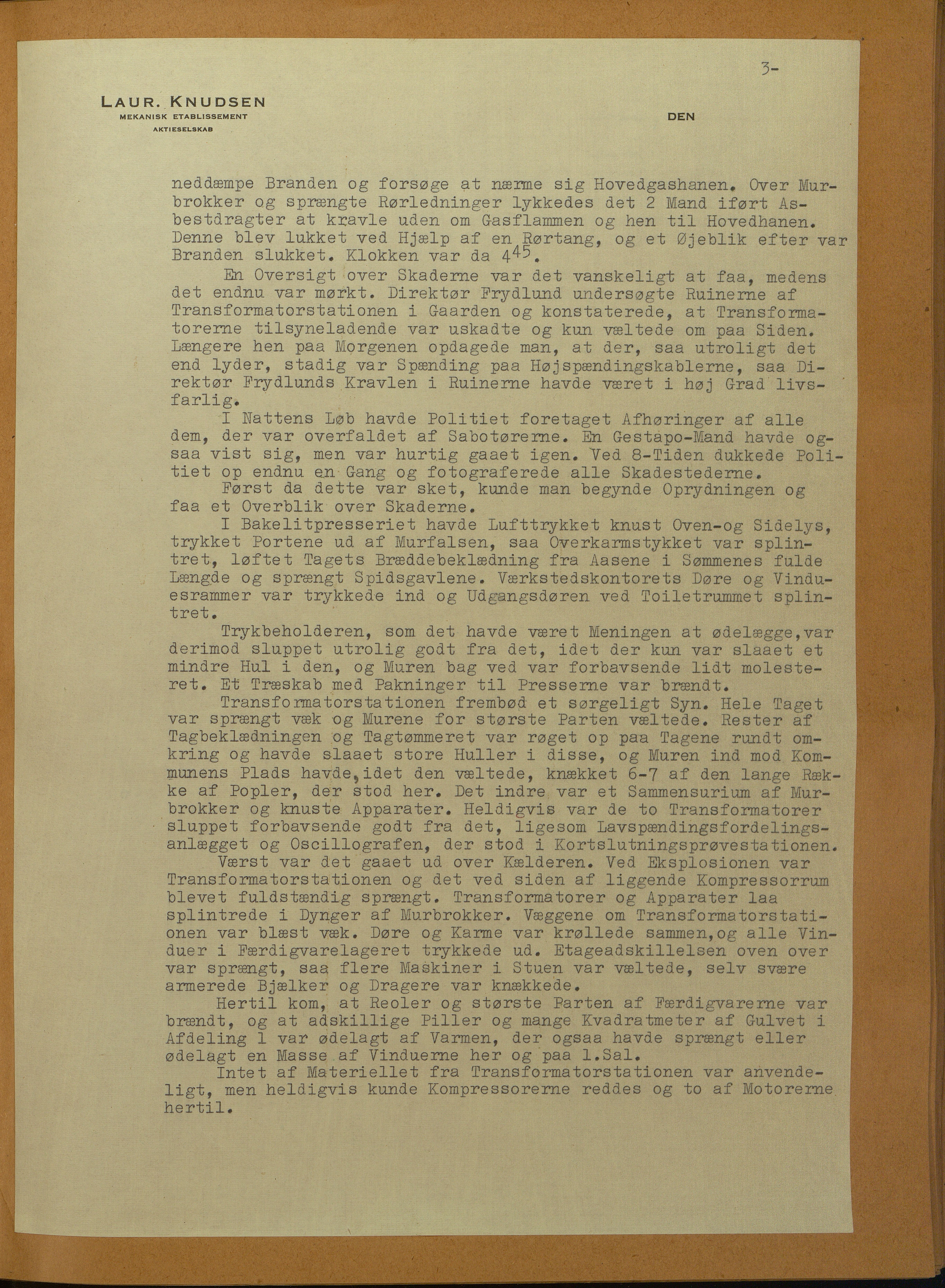 Enkeltside fra fotoalbum fra virksomheden Lauritz Knudsen: Sabotagen hos Laur. Knudsen d. 24. August 1943.