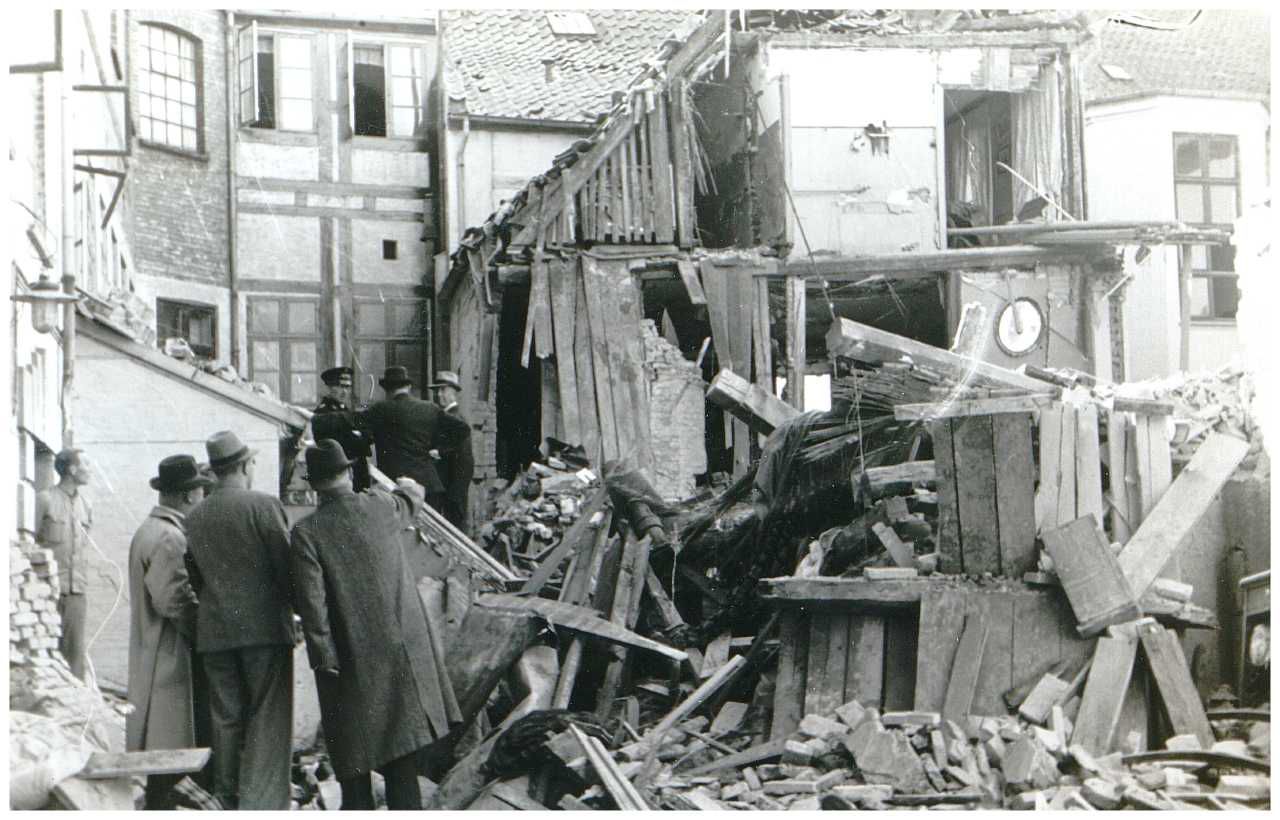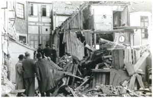 Enkeltfoto fra fotoalbum med seriebilleder fra 9. April 1940 og bombardementerne af Aalborg i 1940. Desuden bombeskadede bygninger i Nyborg samt nedskudte allierede fly.