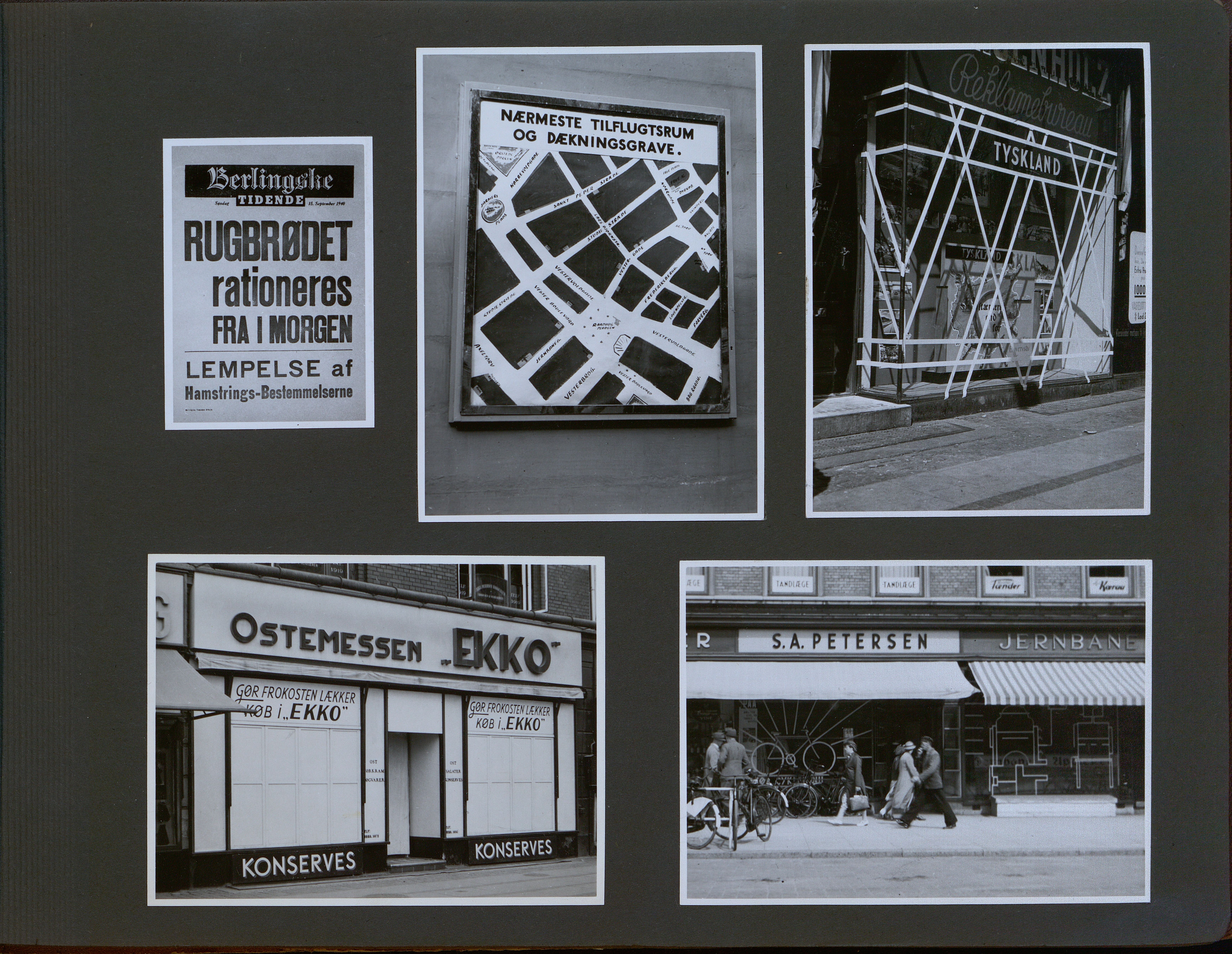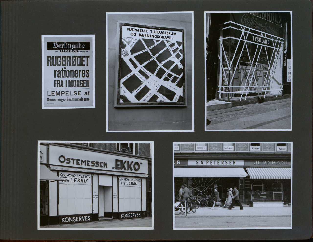 Enkeltside fra fotoalbum der har tilhørt fotohandler Jens Christian Høeg fra Randers. Indeholder mest ikke-originale fotos fra 1940-41 bl.a. med: minesprængte skibe, Lufwaffe enheder og antiluftskyts, Alsang, bomberydning, spildindsamling samt nedskudte tyske fly m.m.